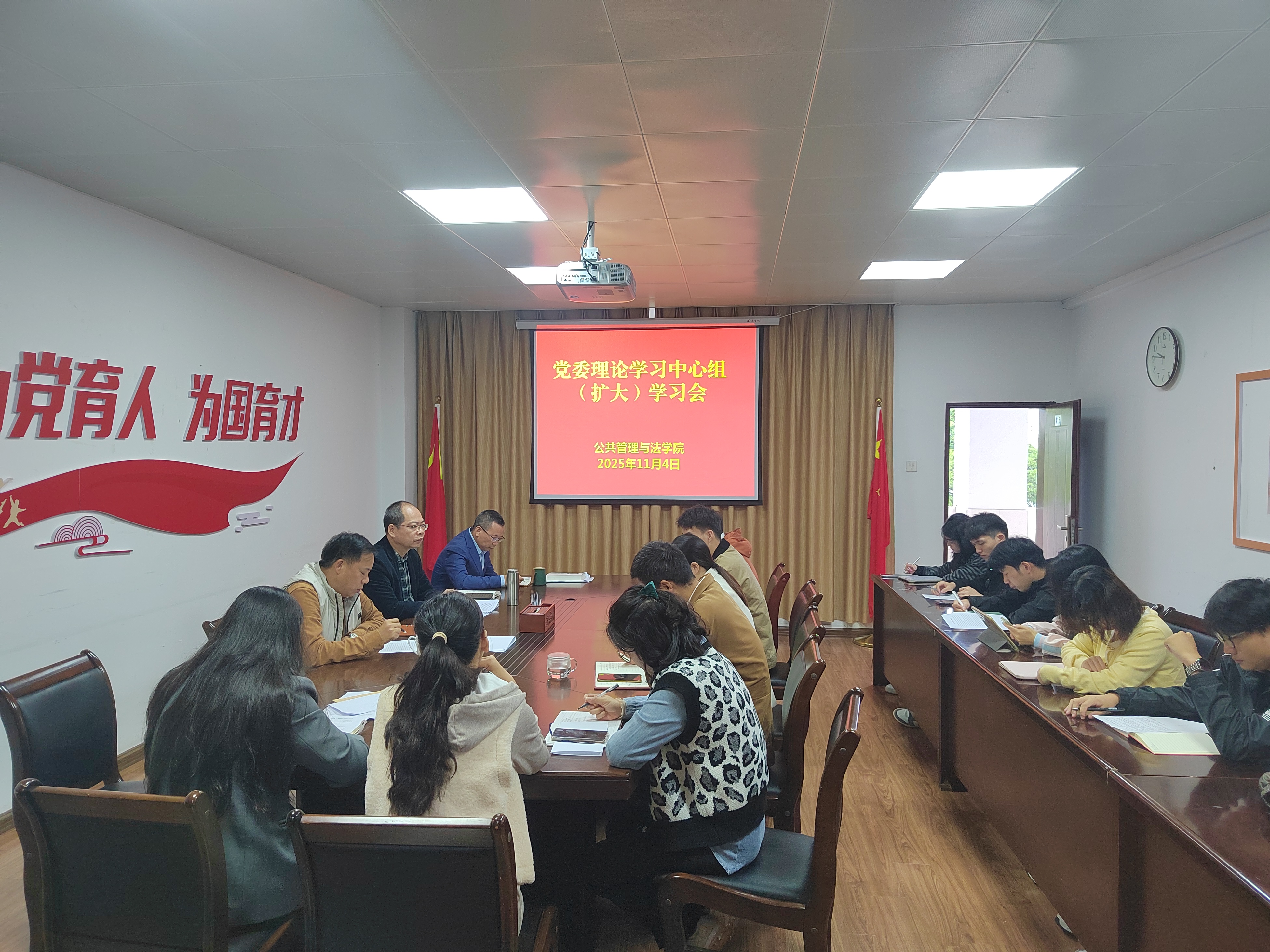 11月4日上午,公共管理与法学院党委组织召开理论学习中心组(扩大)学习会,专题传达学习习近平总书记在党的二十届四中全会上的重要讲话精神和全会精神,认真学习福建省委常委会扩大会议精神,研究学院贯彻落实举措。学院党委理论学习中心组成员、全体党支部书记参加会议,院党委书记蓝天水主持会议。