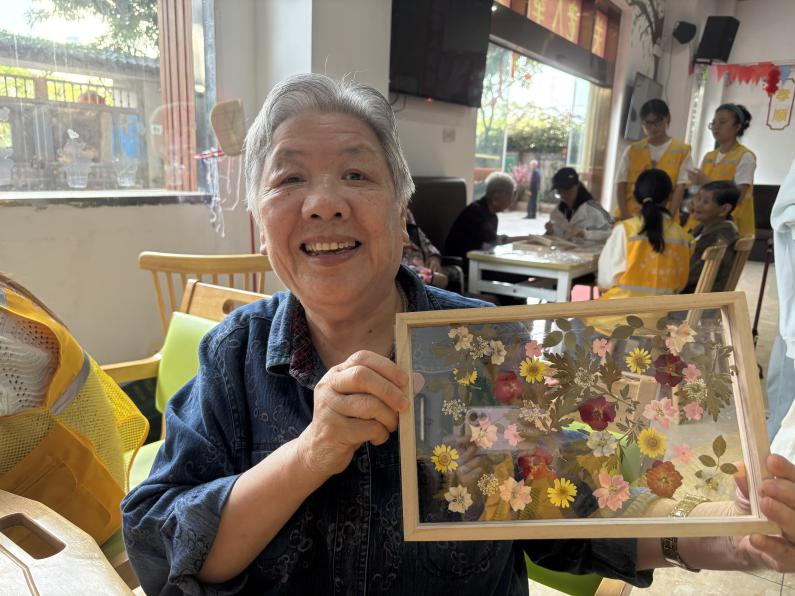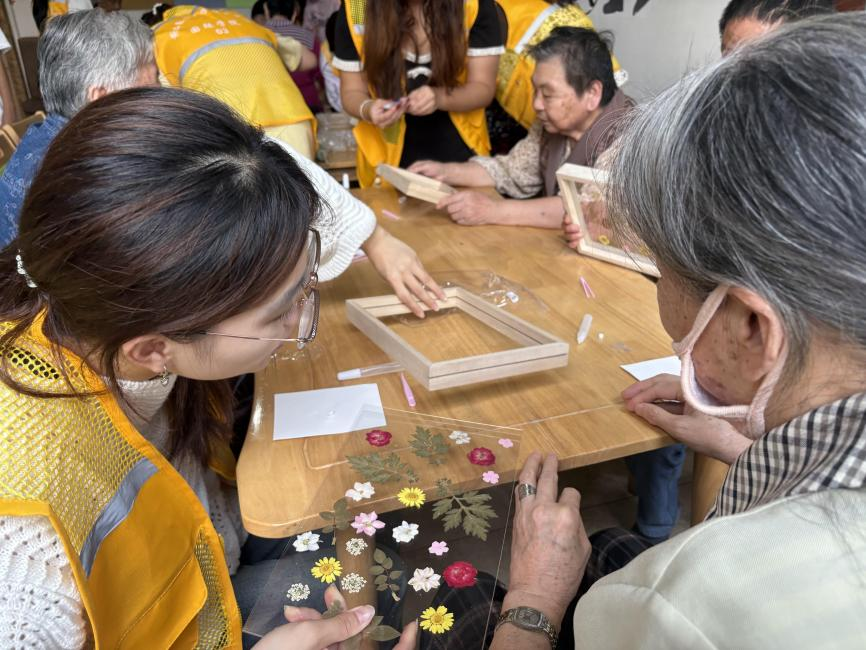 活动现场,志愿者提前将干花材料、相框与工具分类摆放整齐。在讲解制作流程后,老人们充分发挥创意,挑选花材,设计造型,志愿者在旁耐心协助粘贴与组装。过程中,志愿者与老人亲切交流,关心他们的日常生活和身体状况,聆听他们分享的人生经历,现场洋溢着温馨的氛围。