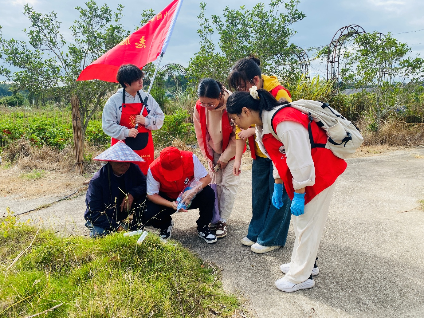 活动现场,科技小院的志愿者身着红色志愿马甲,与当地农户面对面交流。赵岩老师带领团队成员,蹲在田间地头,为农户细致讲解红火蚁的识别特征、危害原理以及科学防治方法。志愿者还准备了科普资料和防治工具,手把手指导农户如何辨别红火蚁巢穴、如何安全使用药剂进行防治,切实提升农户对红火蚁的防控能力。