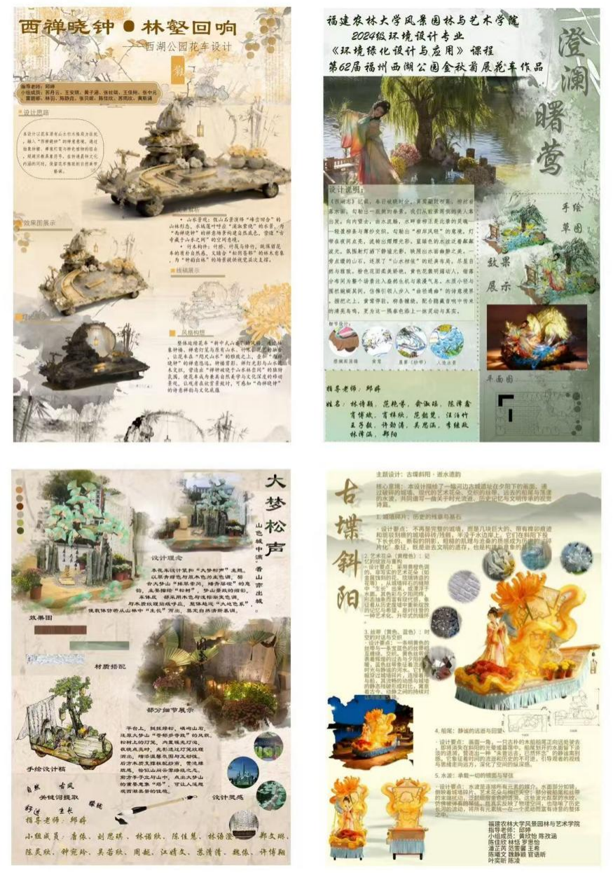 《环境绿化设计与应用》为福建省线上线下混合式一流课程,通过植物认知、绿化调研、虚拟仿真实验教学以及设计实践,学生在理解植物的观赏特性、生态习性和花木文化的基础上能进行创新性设计。本次花车设计围绕西湖公园代表性古八景展开,学生需在有限周期内完成从文化解读、装置设计到材料选配、手工制作的全流程实践。制作过程中,学生选用竹篾、木材、麻绳、布艺、金属、泡沫等材料营造叠水效果、模拟山石轮廓,并巧妙搭配不同色彩与形态的菊花品种,使古典景致在花车上焕发新生。
