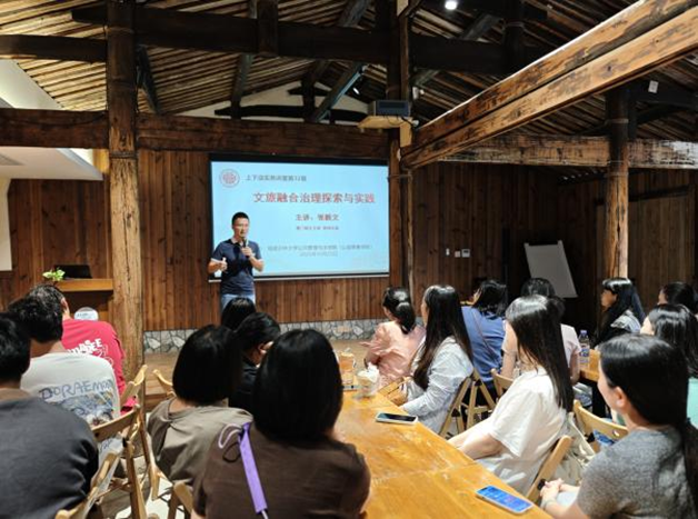 数百年风雨洗礼过的古厝何以重生?多元主体参与的传统村落共治路径如何形成?……关于古厝,在栖身三落厝的2天1夜里,实践队师生有很多疑问与思考。由此,公共管理硕士(MPA)教育中心特邀请三落厝修复改造的主要操盘手、厦门朗乡投资有限公司副总经理张毅文先生做客“上下店实务讲堂”。张毅文副总经理结合三落厝及其他同类项目的实操经验,先后做了两场《文旅融合治理探索与实践》的精彩报告,为MPA同学提供了不同于课堂的思考维度,引发了关于政府与市场关系、项目可持续性等问题的热烈讨论。