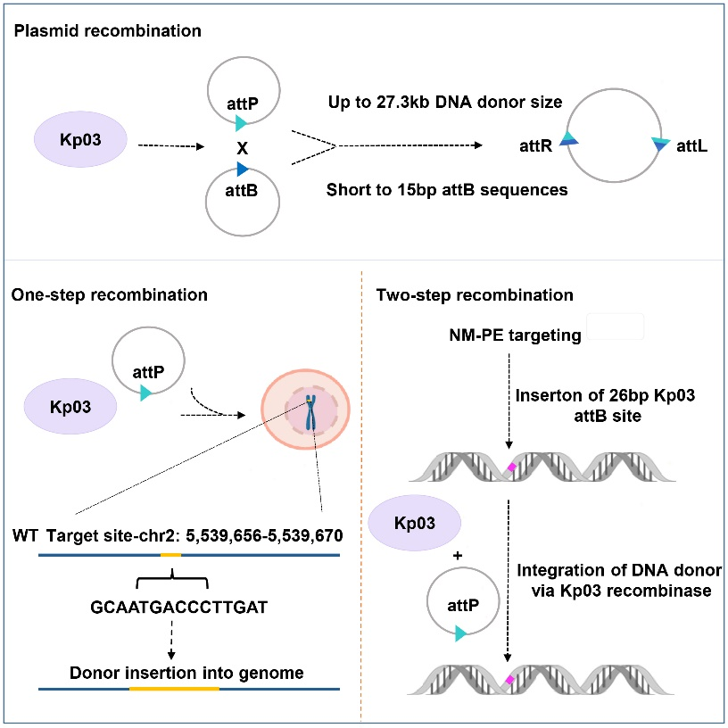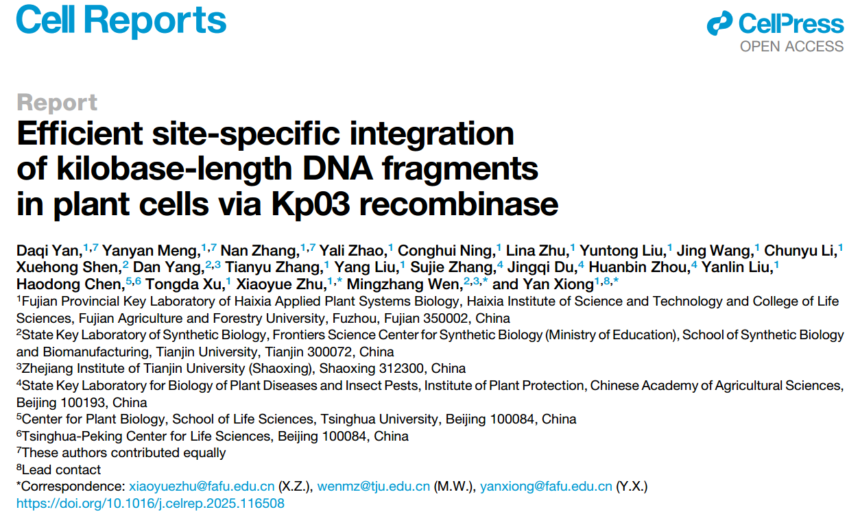 近日,开云网页版海峡联合研究院联合天津大学在《细胞报告》Cell Reports杂志上发表了题为“Efficient site-specific integration of kilobase-length DNA fragments in plant cells via Kp03 recombinase”(Kp03:一种植物新型DNA大片段重组系统,可实现kb级DNA大片段高效定向整合)的研究论文,报道了利用Kp03大丝氨酸重组酶在植物细胞中进行高效靶向DNA大片段整合的研究。