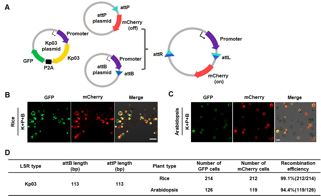 该研究团队首先在植物细胞中利用三质粒系统评估了Kp03大丝氨酸重组酶在质粒水平上的整合能力。在水稻和拟南芥原生质体中,Kp03介导的重组效率分别高达99.1%和94.4%,且该重组酶在植物细胞内的活性不需要额外的辅助因子。