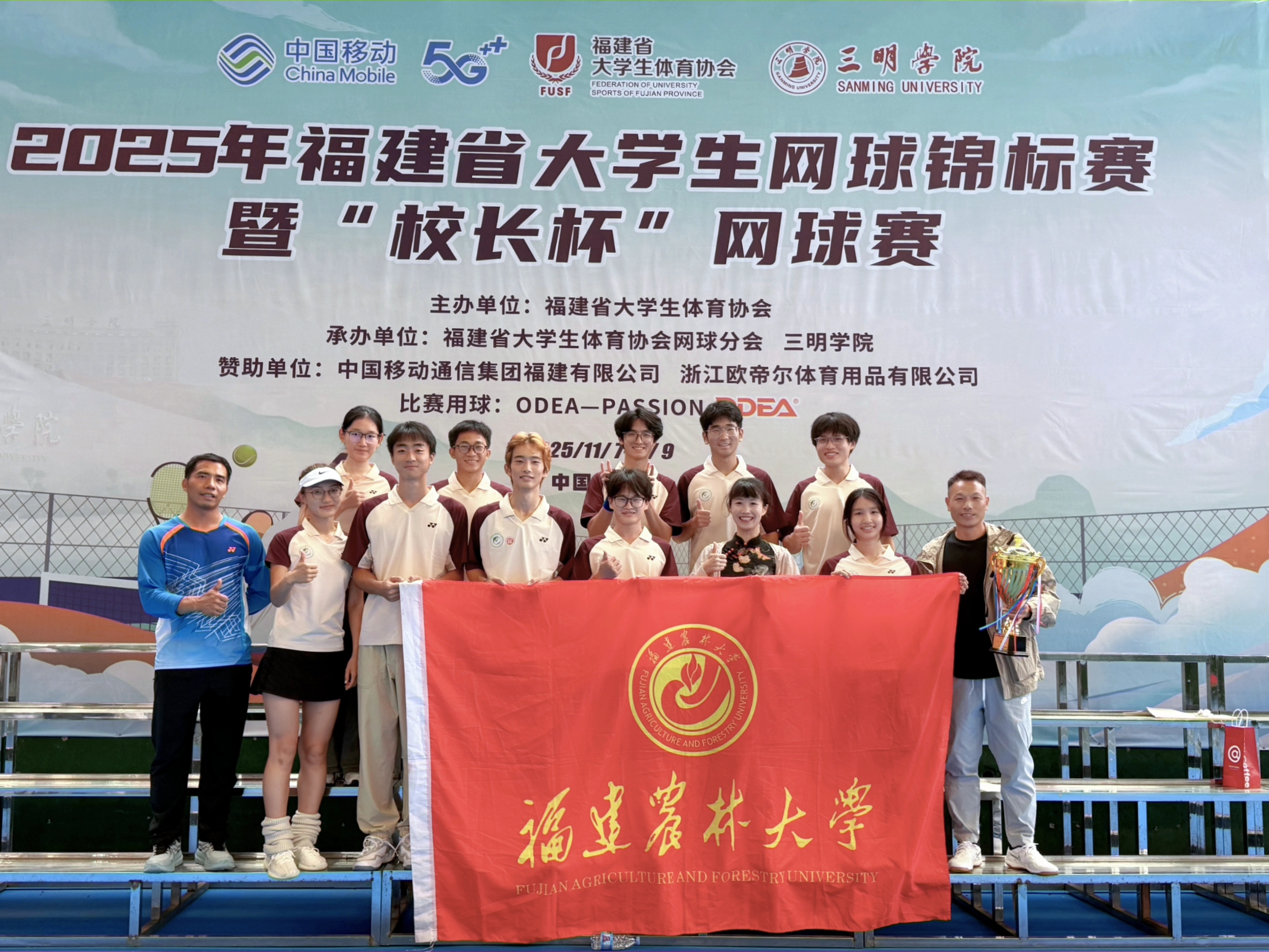 这份成绩是对我校网球队系统训练成果的一次检阅,也是团队凝聚力的生动体现。优异成绩的取得,离不开学校对体育事业的高度重视与大力支持,学校体育场馆设施不断完善和提升,特别是丁秀霞网球馆为校队日常训练提供了坚实保障。此次锦标赛提升技战术水平,锤炼意志品质,也希望队员们以此次荣誉为新的起点,戒骄戒躁、持续奋进,在未来的网球赛事中继续突破自我,为校再添荣光,让农林大的网球精神在更多赛场闪耀!