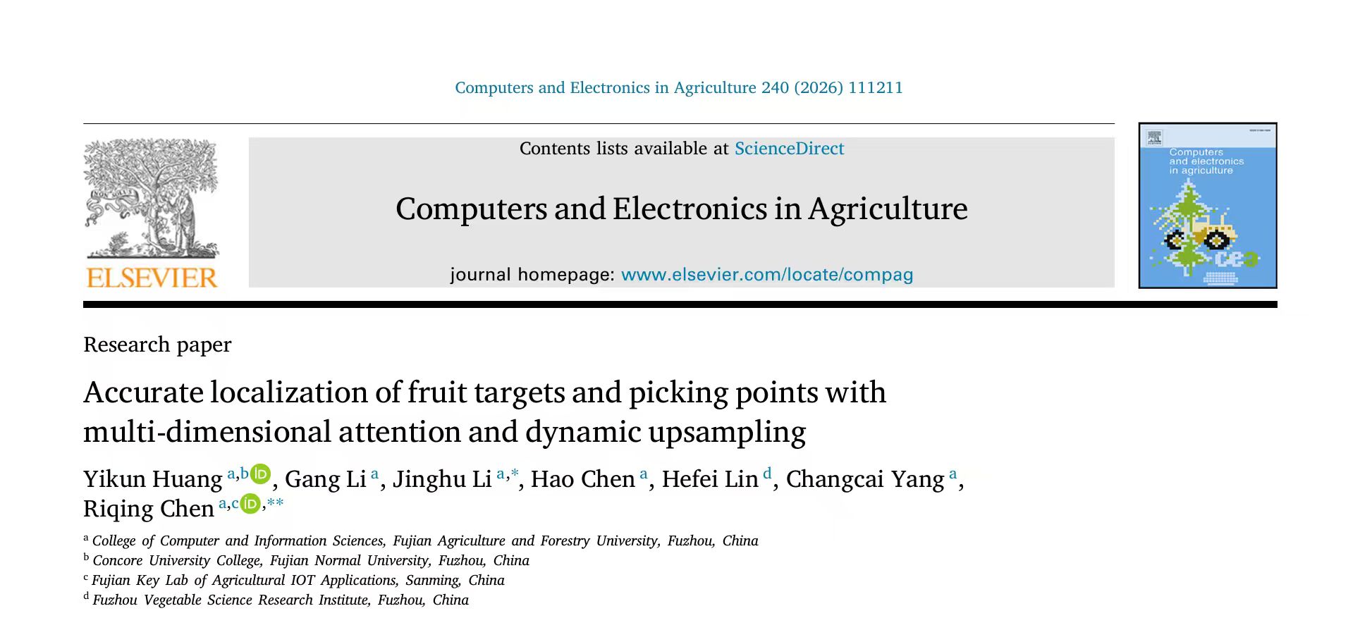 近日,开云网页版农业人工智能研究院具身智能课题组在计算机与农林科学领域国际著名期刊《Computers and Electronics in Agriculture》发表题为“Accurate localization of fruit targets and picking points with multi-dimensional attention and dynamic upsampling”(基于多维注意力和动态上采样的果实目标和采摘点精确定位)研究论文。该期刊是中国科学院一区Top期刊,是全球唯一在“农业综合”与“计算机:跨学科应用”双领域登顶一区的SCI期刊,2025年影响因子8.9,在“农业综合”学科的89本期刊中排名第1。计算机与信息学院博士生黄艺坤为第一作者,李景虎教授和陈日清教授为共同通信作者。
