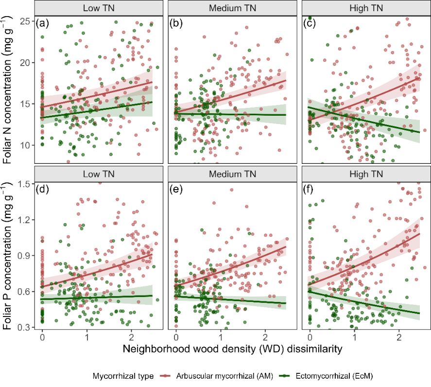 图1 菌根类型与土壤氮含量共同调节叶片氮磷浓度对邻域树种多样性(木材密度不相似度)的响应