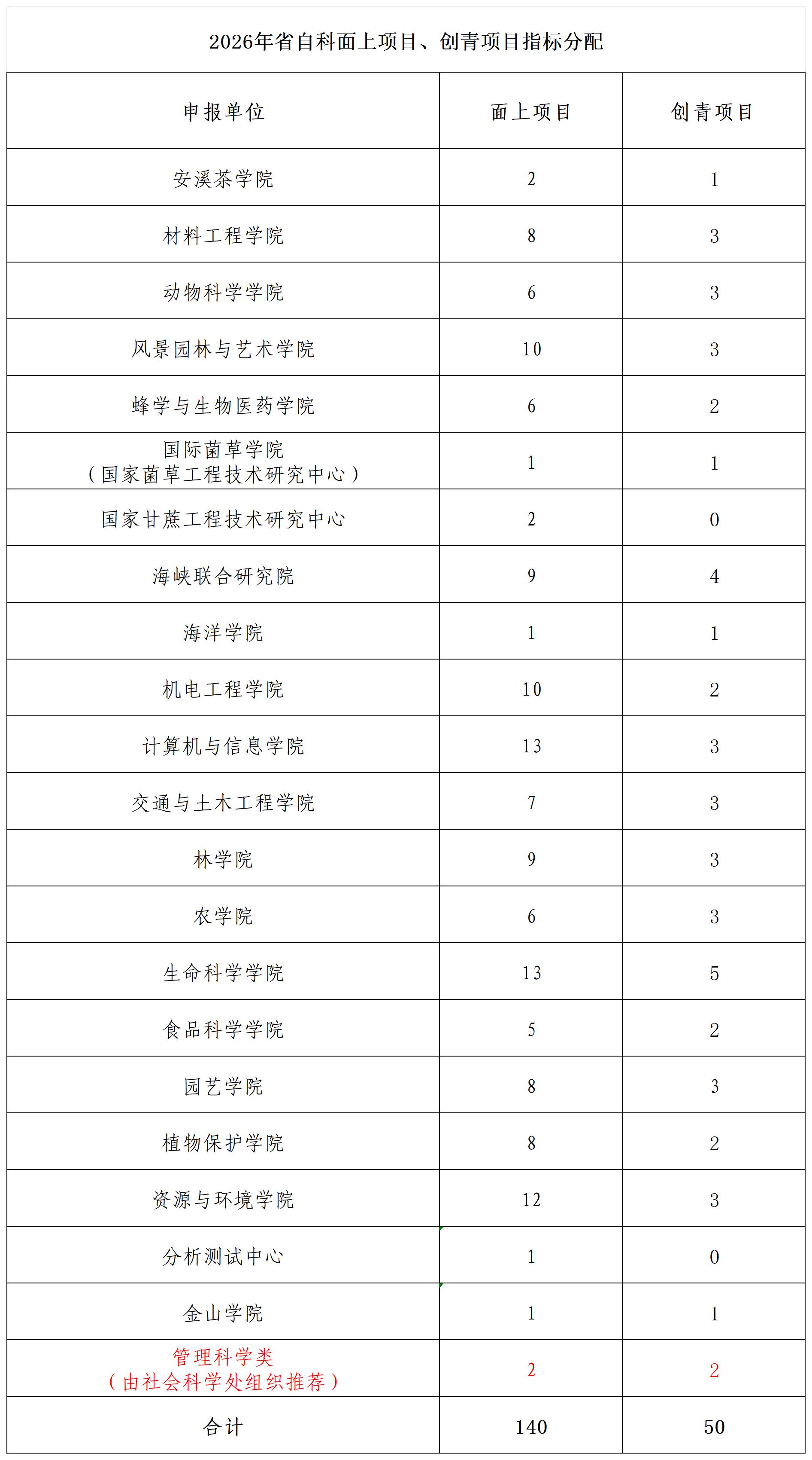 五、省自然科学基金面上项目(高校联合)、创青项目推荐指标分配至各二级单位。指标分配情况如下表,各二级单位可酌情备选1项。