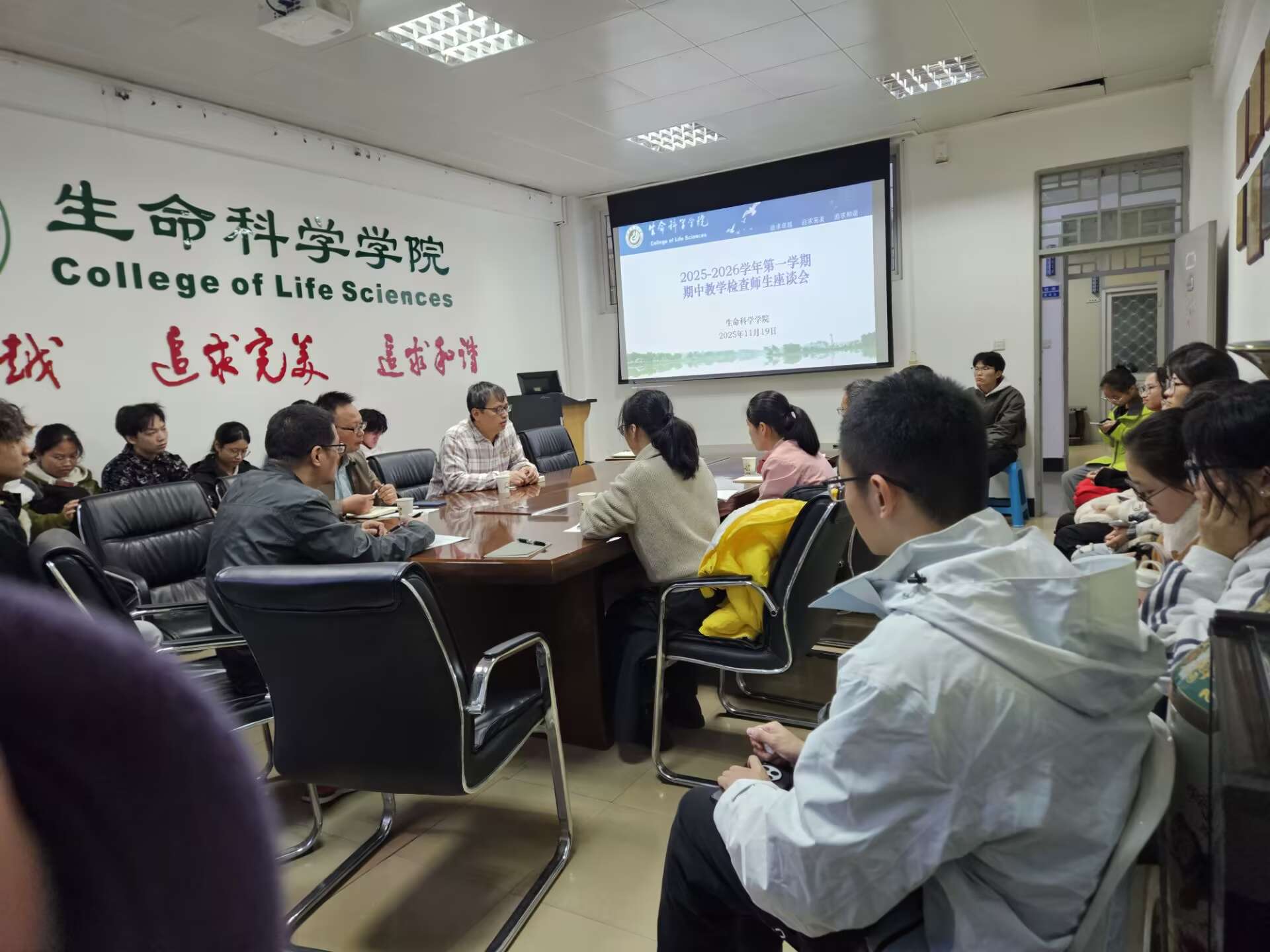 11月19日下午,生命科学学院于生科楼404召开2025-2026学年第一学期期中教学检查师生座谈会。学院副院长黄天培、各系教师代表、各班学生代表和本科教育教学办工作人员30多人参会。会议由黄天培主持。