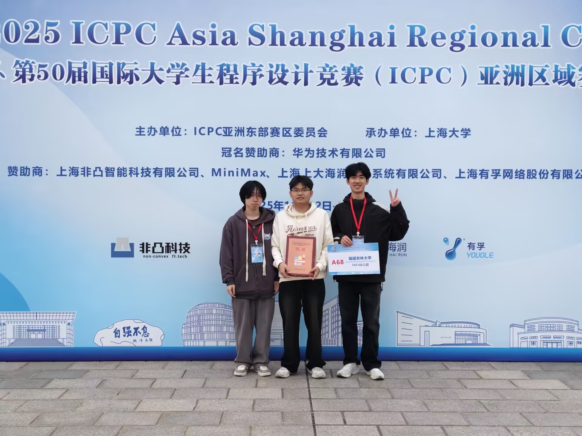 此次获奖团队来自计算机与信息学院“程序设计创新实验室”,成员为严其旺(2022级软件工程)、陈明扬(2022级软件工程)、林学士(2023级计算机科学与技术)。赛事期间,团队成员分工明确、配合默契,在高强度的竞赛环境中沉着思考、高效攻坚,最终凭借稳定发挥从300多支参赛队中脱颖而出,获得铜奖。