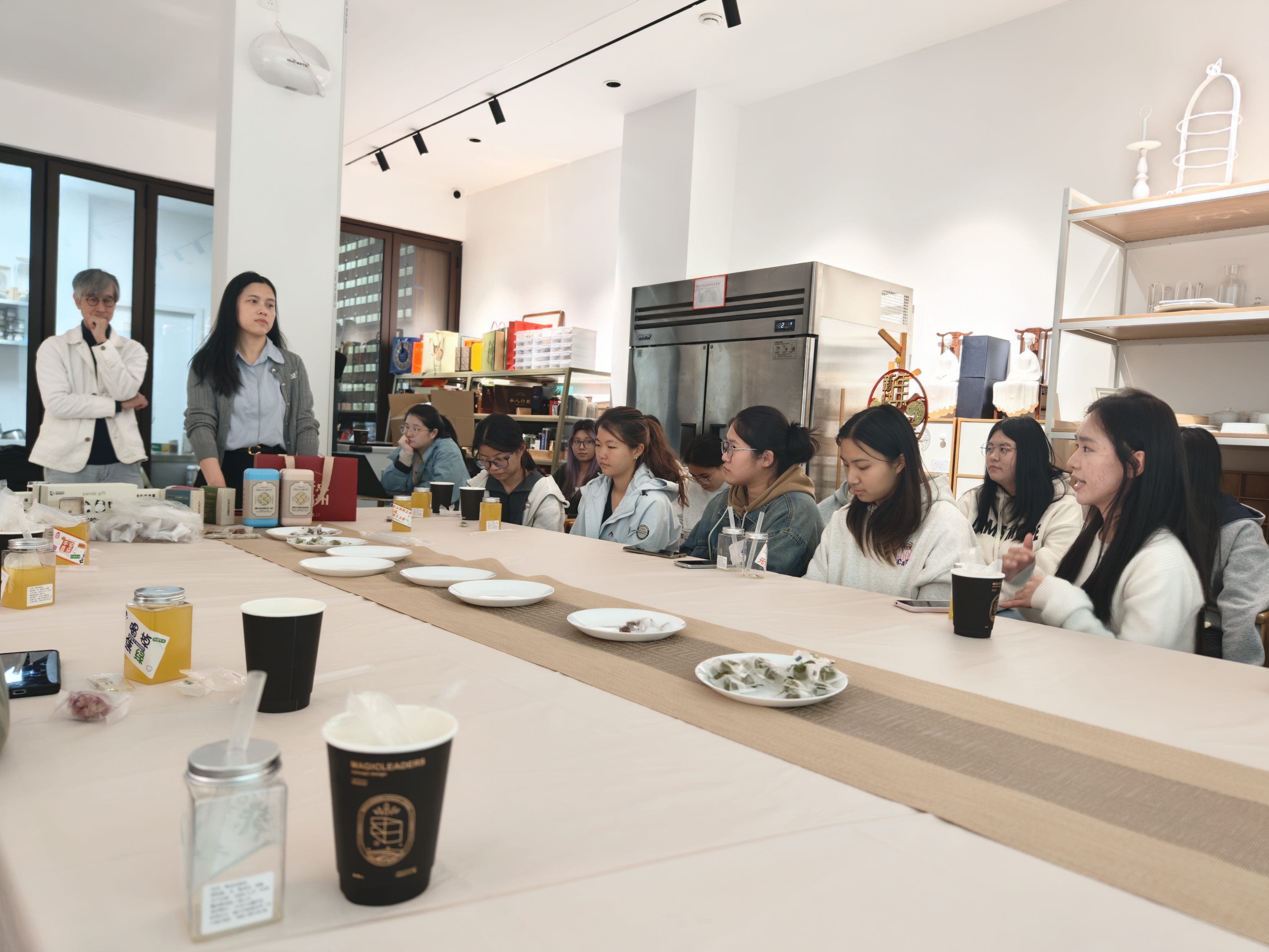 在“初识麦壳里”环节,通过观摩,同学们熟悉了食品从生产到销售的全链条环节。企业品牌顾问墨城老师讲解了现代食品科技与传统食养文化相融合的创新理念与发展路径,介绍“从茶点识福州”等多款系列产品的开发过程。他建议同学们在大学既要学好专业“硬知识”,也要注重“软技能”的培育,全面提升自己的就业竞争力。