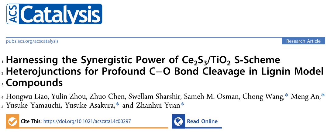 该研究以“Harnessing the Synergistic Power of Ce2S3/TiO2 SScheme Heterojunctions for Profound C−O Bond Cleavage in Lignin Model Compounds”(Ce2S3/TiO2S型异质结协同驱动木质素模型化合物中C-O键深度裂解研究)为题发表于国际期刊ACS Catalysis (美国化学会催化)。开云网页版为论文第一完成单位,材料工程学院博士研究生廖洪武为第一作者,材料工程学院袁占辉教授、北京理工大学安盟教授、日本名古屋大学的Yusuke Asakura教授为共同通讯作者。