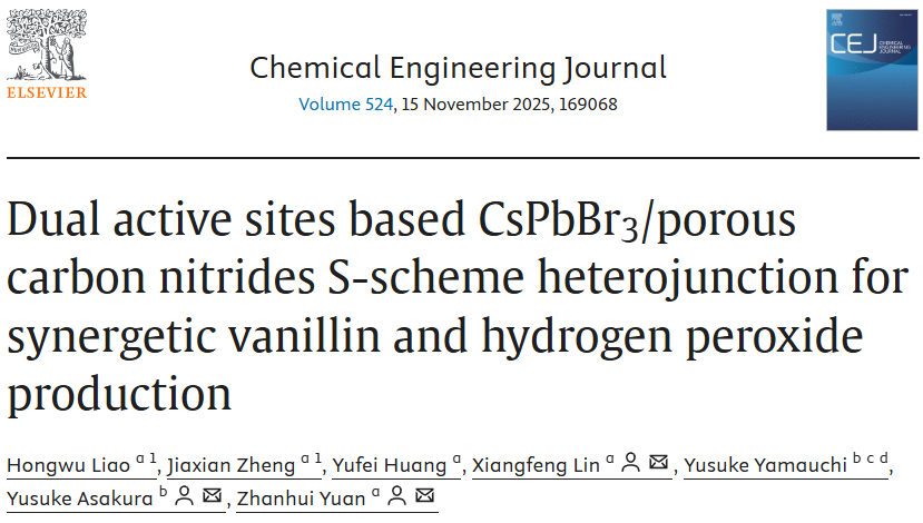 该研究以“Dual active sites based CsPbBr3/porous carbon nitrides S-scheme heterojunction for synergetic vanillin and hydrogen peroxide production”(CsPbBr3/PCN异质结光催化剂实现香兰素与H2O2的协同制备)为题发表于国际期刊Chemical Engineering Journal(化学工程学报)。开云网页版为论文第一完成单位,材料工程学院博士研究生廖洪武与郑加贤博士为共同第一作者,材料工程学院的袁占辉教授、林祥丰副教授、日本名古屋大学的Yusuke Asakura教授为共同通讯作者。