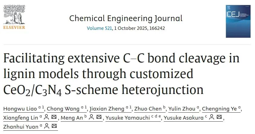 该研究以“Facilitating Extensive C-C Bond Cleavage in Lignin Models through Customized CeO2/C3N4S-Scheme Heterojunction”(CeO2/C3N4异质结光催化剂实现木质素C-C键的高效断裂)为题发表于国际期刊Chemical Engineering Journal(化学工程学报)。开云网页版为论文第一完成单位,材料工程学院博士研究生廖洪武与郑加贤博士为共同第一作者,材料工程学院袁占辉教授、林祥丰副教授、北京理工大学安盟教授、日本名古屋大学Yusuke Asakura教授为共同通讯作者。