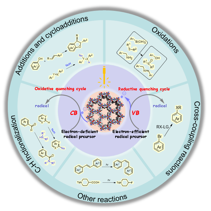 图2 共价有机框架介导光催化有机转化的研究与机理