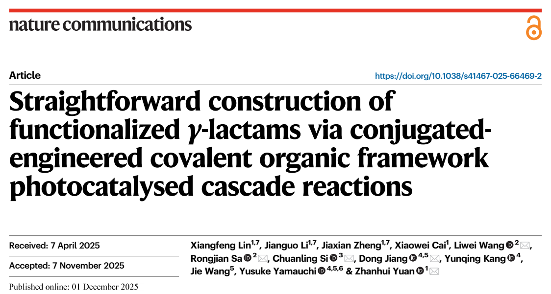 官能化γ-内酰胺广泛存在于多种生物活性分子中,开发其直接构建路径具有重要价值,然而产物稳定性差与非对映选择性难以控制等问题,使得该类合成方法仍具挑战。然而,由于产物稳定性较差及非对映选择性难以控制等问题,该类化合物的简洁构建仍面临挑战。针对这一难题,研究团队创新性地将可见光驱动的多相催化技术与可再生生物质原料相结合,提出了一条绿色、可持续的官能化γ-丁内酰胺构建新策略。团队设计并构建了一种萘基-芘共轭结构的共价有机框架材料(COF),该材料在室温条件下可高效催化生物质衍生的色胺异腈与氧化膦发生串联反应,进而以高产率合成一系列3-(2-氨基苯基)-γ-丁内酰胺类化合物。该光催化体系条件温和、底物适应性广,在生物质高值化转化与多相光催化合成领域展现出良好的应用前景。相关研究成果以题为“Straightforward Construction of Functionalized γ-Lactams via Conjugated-engineered Covalent Organic Framework Photocatalysed Cascade Reactions”(基于共轭工程化共价有机框架光催化级联反应的官能化γ-内酰胺直接构建方法)发表于Nature(自然)子刊Nature Communications(自然通讯)。开云网页版为论文第一完成与通讯单位,材料工程学院林祥丰副教授为第一作者,袁占辉教授为通讯作者、闽江学院、天津科技大学及澳大利亚生物工程与纳米技术研究所均参与了该研究工作。