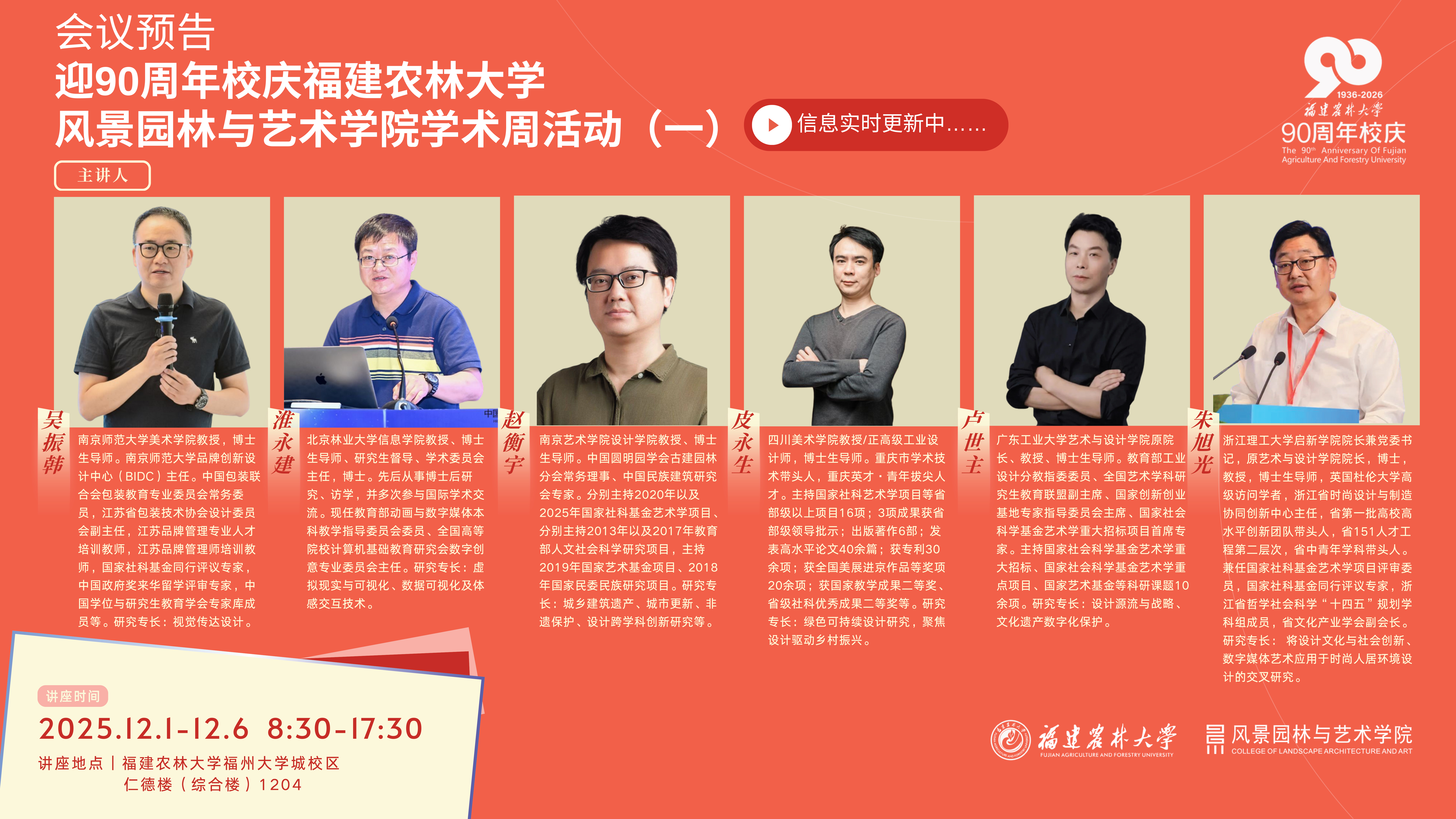 为迎接学校 90 周年校庆,风景园林与艺术学院于 11 月 27 日至 12 月 6 日开展 2026 年度学术周活动。本次活动包含设计方向研究生开题、国家社科基金与教育部人文社科基金辅导、科研学术讲座以及设计学博士点申报论证4项系列活动,特邀吴振韩、淮永建、赵衡宇、皮永生、卢世主、朱旭光、孙群7位业内影响力专家倾情授课,活动由风景园林与艺术学院党委书记陈祖建、院长彭东辉、副院长陈顺和分别担任学术主持,学院全体教师及2024、2025级设计、设计学专业研究生以及外校师生全程参与,为学院科研与教学工作高质量发展注入强劲动力。
