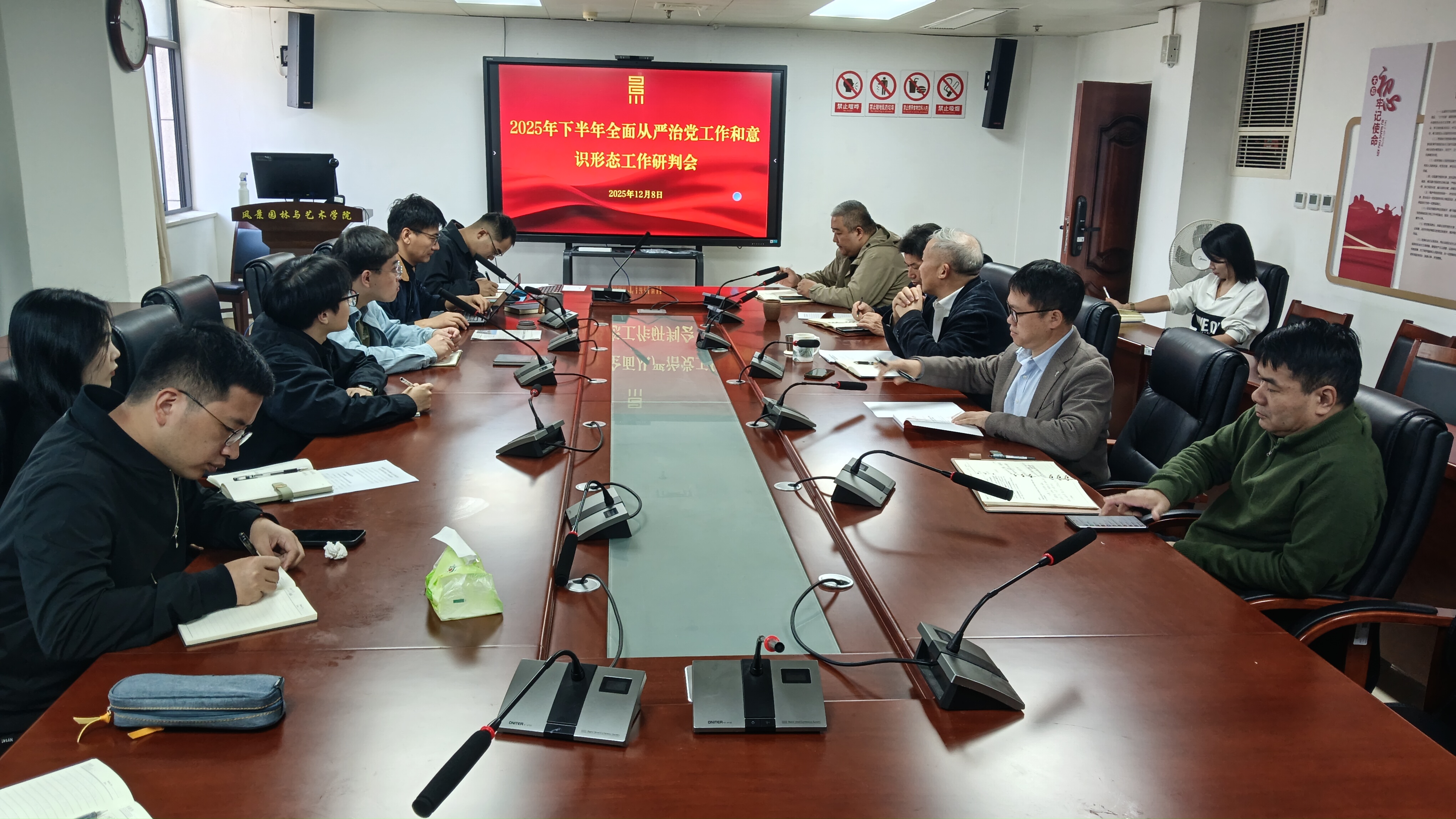 12月8日上午,风景园林与艺术学院在大学城校区仁德楼1102-4会议室召开2025年下半年全面从严治党工作和意识形态工作研判会,学院领导班子成员、科级干部以及辅导员代表参会,会议由学院党委书记陈祖建主持。