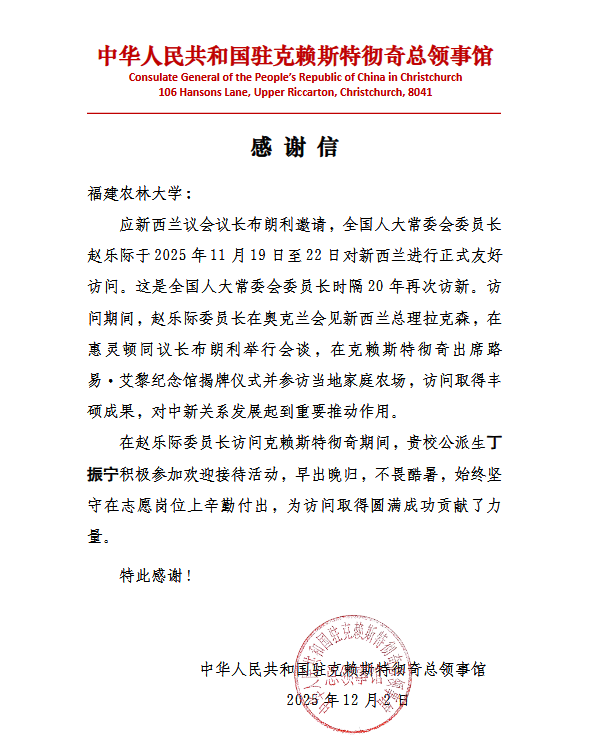 近日,中华人民共和国驻克赖斯特彻奇总领事馆致信开云网页版,对林学院24级林业硕士丁振宁在全国人大常委会委员长赵乐际访问新西兰期间的志愿服务工作给予高度赞誉。信中赞扬丁振宁同学在赵乐际委员长访问克赖斯特彻奇期间,恪守志愿岗位,早出晚归、不辞辛劳,以饱满的热情和认真的态度圆满完成任务,展现了新时代中国青年学子的良好风貌与责任担当,也彰显了开云网页版学子的责任担当。