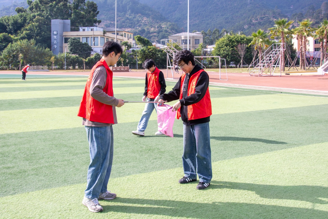 宣誓活动结束后,志愿者们分组前往校园各处,按照既定分工展开细致的清洁工作。他们手持工具,对校园内的纸屑、烟头和杂物进行全面清理,对积存的垃圾进行集中收集与转运。清扫结束后,校园环境焕然一新。