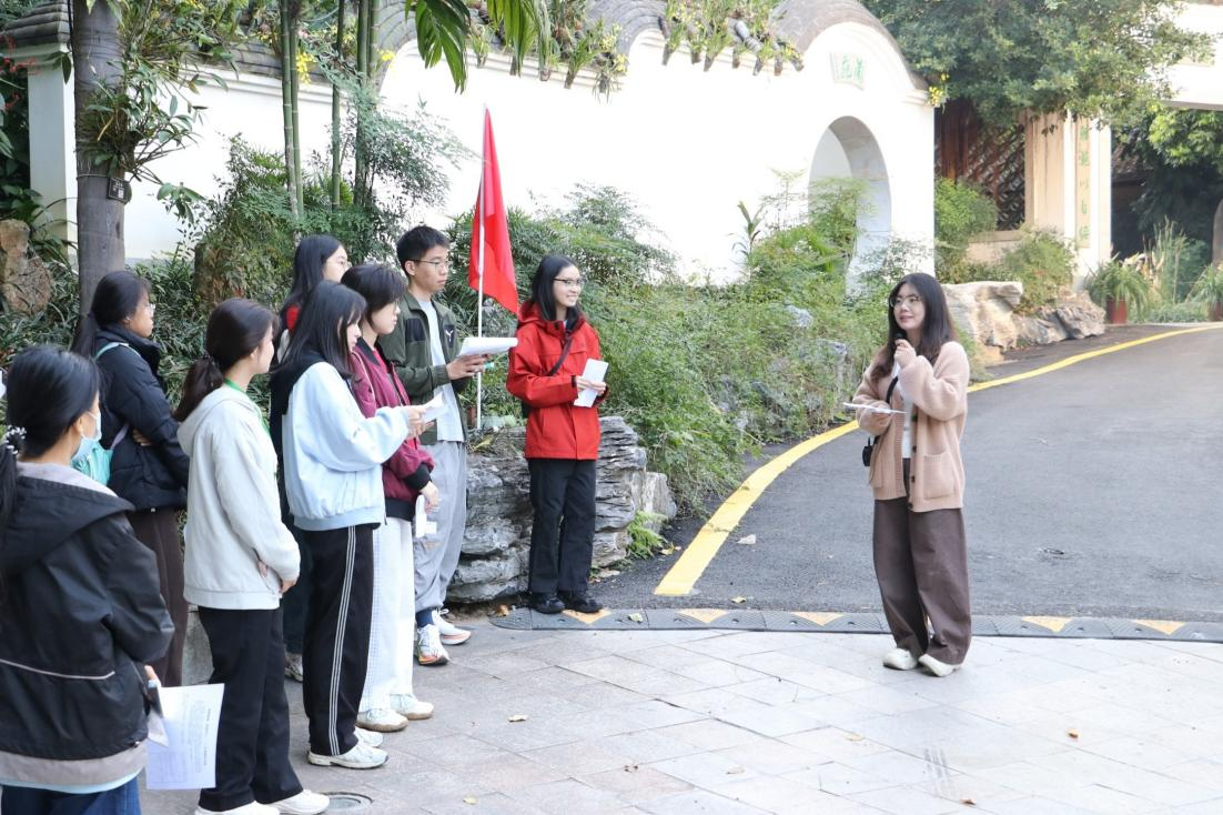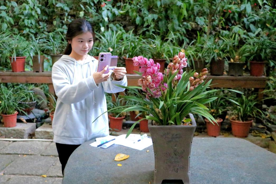 活动伊始,同学们在生态文明讲解队的引领下步入兰苑。从兰蕙争艳区到空谷幽兰区再到墨香兰韵区,讲解员们生动介绍了兰草科属分布情况、隐逸文化以及国兰文化等。在专业又不失趣味的讲解中,同学们不仅增长了植物知识,更逐渐沉浸于自然的静谧与生机之中。讲解员的声音与兰苑的鸟鸣、风声交织,同学们在“听”中捕捉自然的韵律,感受兰草从科学到文化的声景叙事。