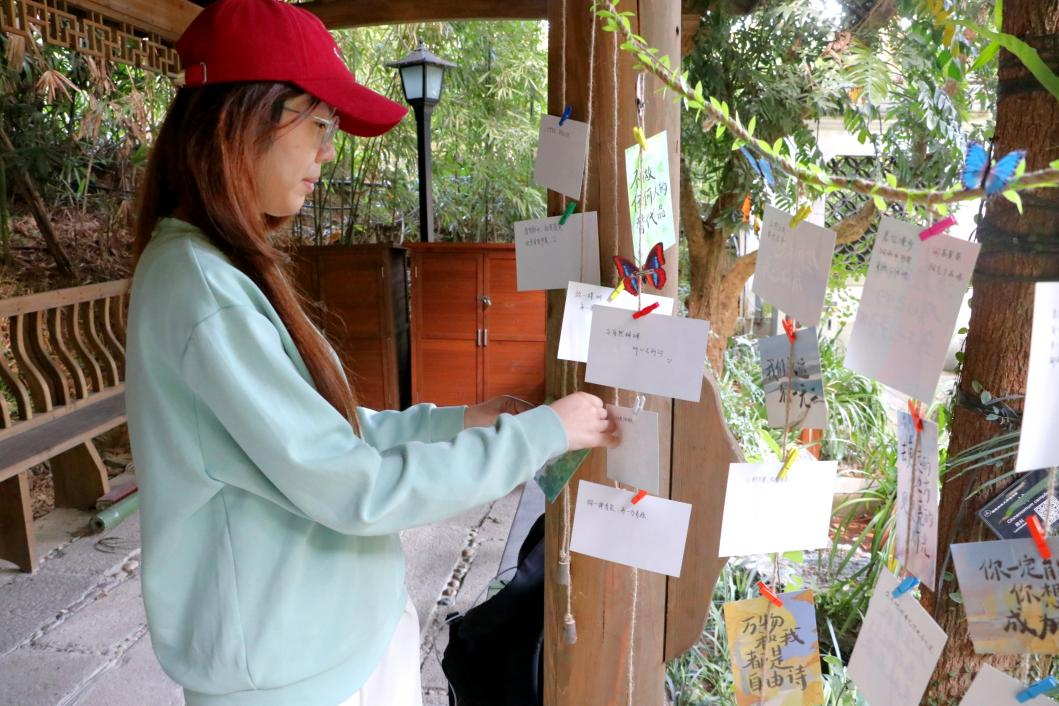 “自然物语·心灵回响墙”环节,同学们闭眼轻嗅兰草,在“闻”中捕捉自然淡雅与浓烈的层次,用文字记录气味引发的记忆与情感,完成一场嗅觉与心灵的对话。同学们在彩卡上认真写下对一花一叶的寄语、对生态保护的感悟,一张张彩色卡片被细心夹挂,汇集成一幅承载情感与敬意的“心灵画卷”。