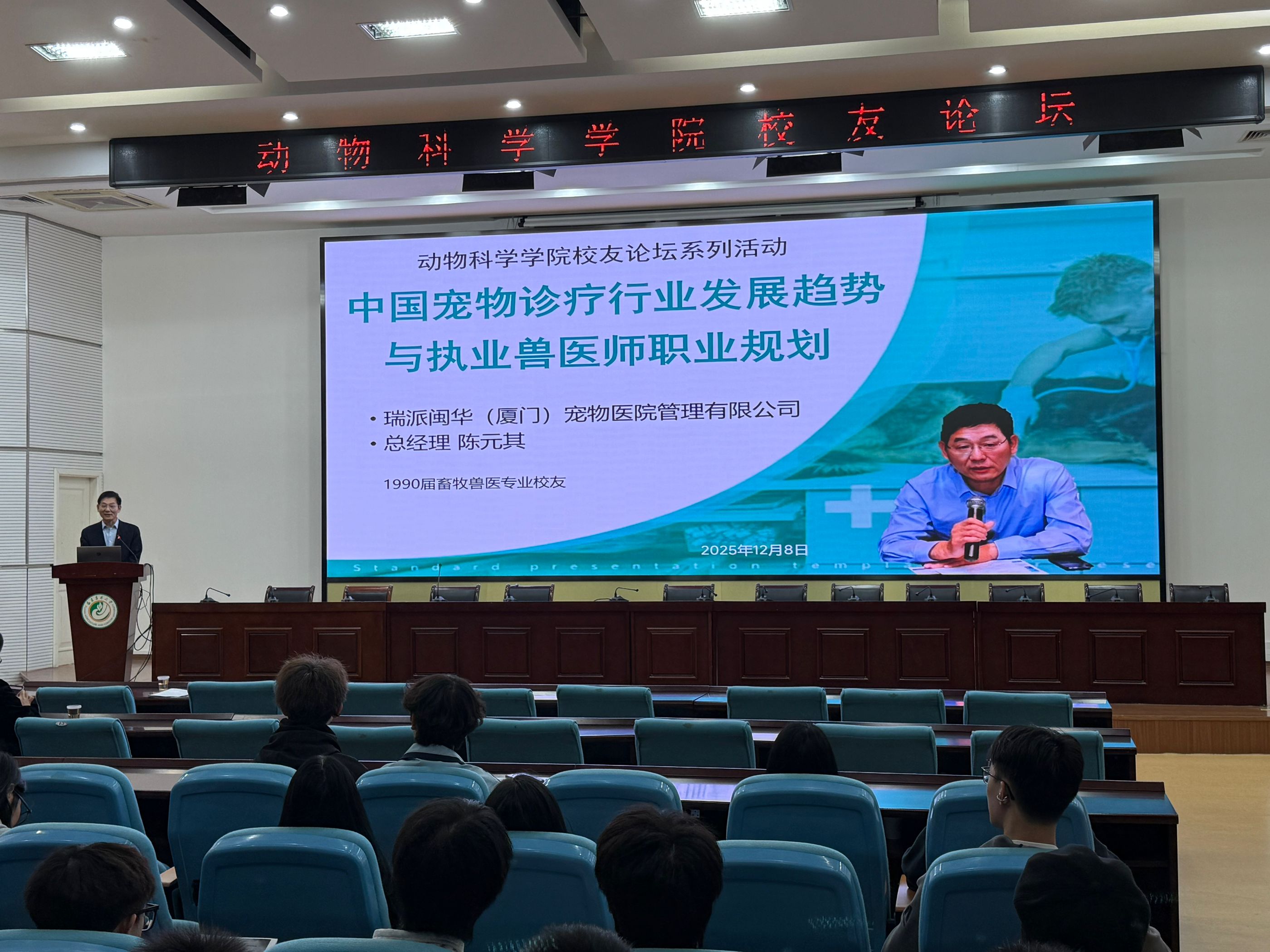 12月8日晚,动物科学学院2025-2026学年第三期校友论坛在福州仓山校区禧强楼学术报告厅召开,动物科学学院1990届优秀校友、瑞派闽华(厦门)宠物医院管理有限公司总经理陈元其受邀担任主讲嘉宾,为青年学子带来了一场关于“宠物诊疗行业发展与临床执业兽医师职业规划”的精彩分享。论坛由学院党委副书记贺鹏主持。