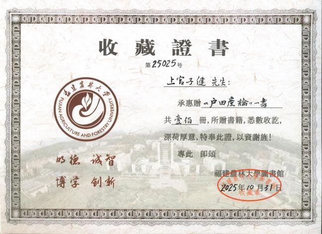 上官子健的慷慨捐赠,不仅丰富了我校图书馆藏资源,也为广大师生学习理解乡村振兴领域前沿理念和实践路径提供了宝贵的学习资料,更体现了他对高等教育和“三农”事业的关心支持。上官子健还曾于2012年发起创立“龙海市白水镇希望之光志愿者队”并担任队长,在扎根乡镇5年间,累计带动上千名志愿者参与乡村公益。其开展的留守儿童父母返乡创业项目获首届中国公益基金会秘书长年会金奖示范项目,该志愿队曾获“福建省青年志愿者优秀组织奖”“中国志愿者青年服务大赛铜奖”。