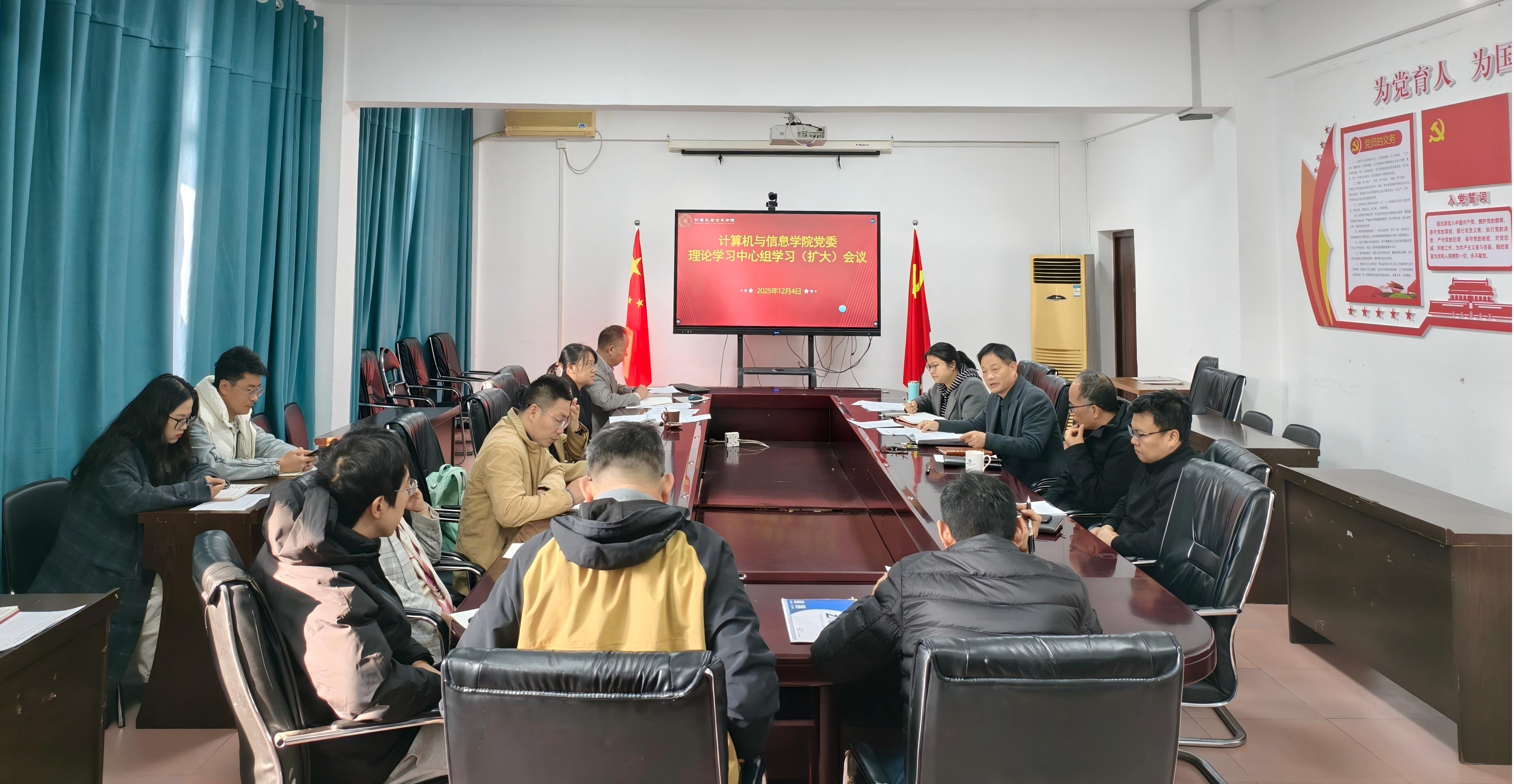 12月4日上午,计算机与信息学院党委召开理论学习中心组(扩大)会议,专题传达学习习近平总书记在中央政治局第二十三次集体学习时的重要讲话精神。学院党委理论学习中心组成员及各党支部书记参加会议。会议由党委书记曾起郁主持。