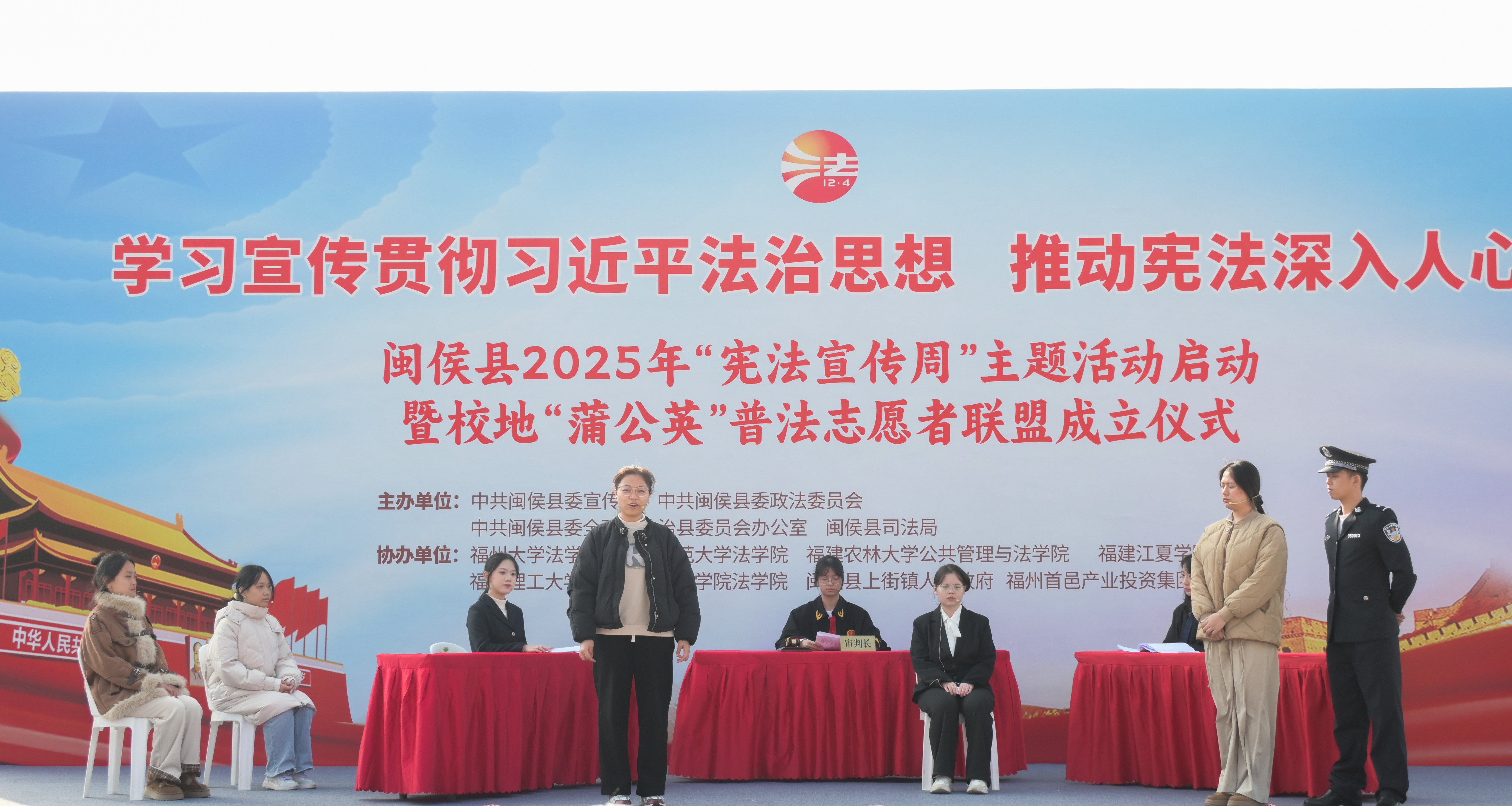 “艺术化”法治剧场,让宪法精神可感可触。12月4日,师生党员前往旗山湖公园北广场参加由中共闽侯县委宣传部、中共闽侯县委政法委员会、中共闽侯县委全面依法治县委员会办公室、闽侯县司法局联合主办的“闽侯县2025年‘宪法宣传周’主题活动启动暨校地‘蒲公英’普法志愿者联盟成立仪式”,带来精心编排的原创普法情景剧《保险陷阱:真相与裁决》,深刻彰显宪法确立的公平正义原则,让观众在情感共鸣中直观体会到宪法是保障公民合法权益的根本依据。