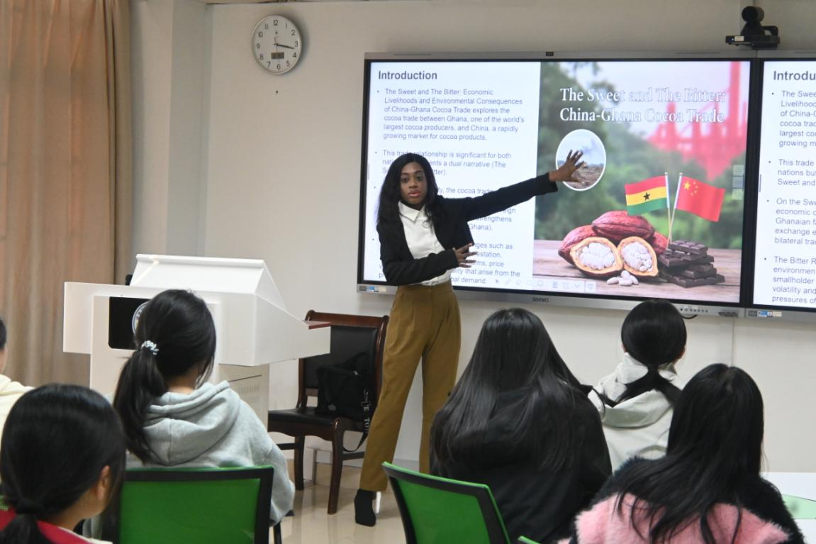 讲座伊始,ESSAH PAULINA ADOBEA 博士以“甜与苦:中国与加纳可可贸易的经济民生和环境影响”为主线,开启专题分享。她系统剖析了这一跨国贸易关系的双重效应,一方面,可可贸易为加纳当地农民带来了显著的生计改善与减贫成效,推动了双边贸易往来的深化,搭建起两国经济交流的重要桥梁;另一方面,贸易发展过程中也面临着环境退化、小农发展受限、市场波动等现实挑战。讲座现场,ESSAH PAULINA ADOBEA 博士还通过翔实的数据和典型案例,让师生对贸易背后的经济逻辑、民生关联与生态影响有了更直观的认知。
