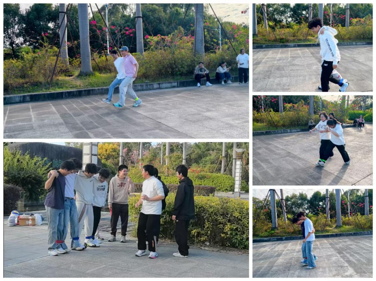 活动中,同学们积极参与“爆破气球”“两人三足”“同心鼓”等多项协作游戏。“爆破气球”环节,大家需紧密配合,在限定时间内合力完成气球爆破,有效增进沟通与配合;“两人三足”游戏里,两两组合的同学协调步伐共同前进,强化团队默契;“同心鼓”项目中,众人围圈击打鼓面,让小球持续跳动,锤炼团队同步与向心力。活动现场氛围热烈,青春活力尽显。