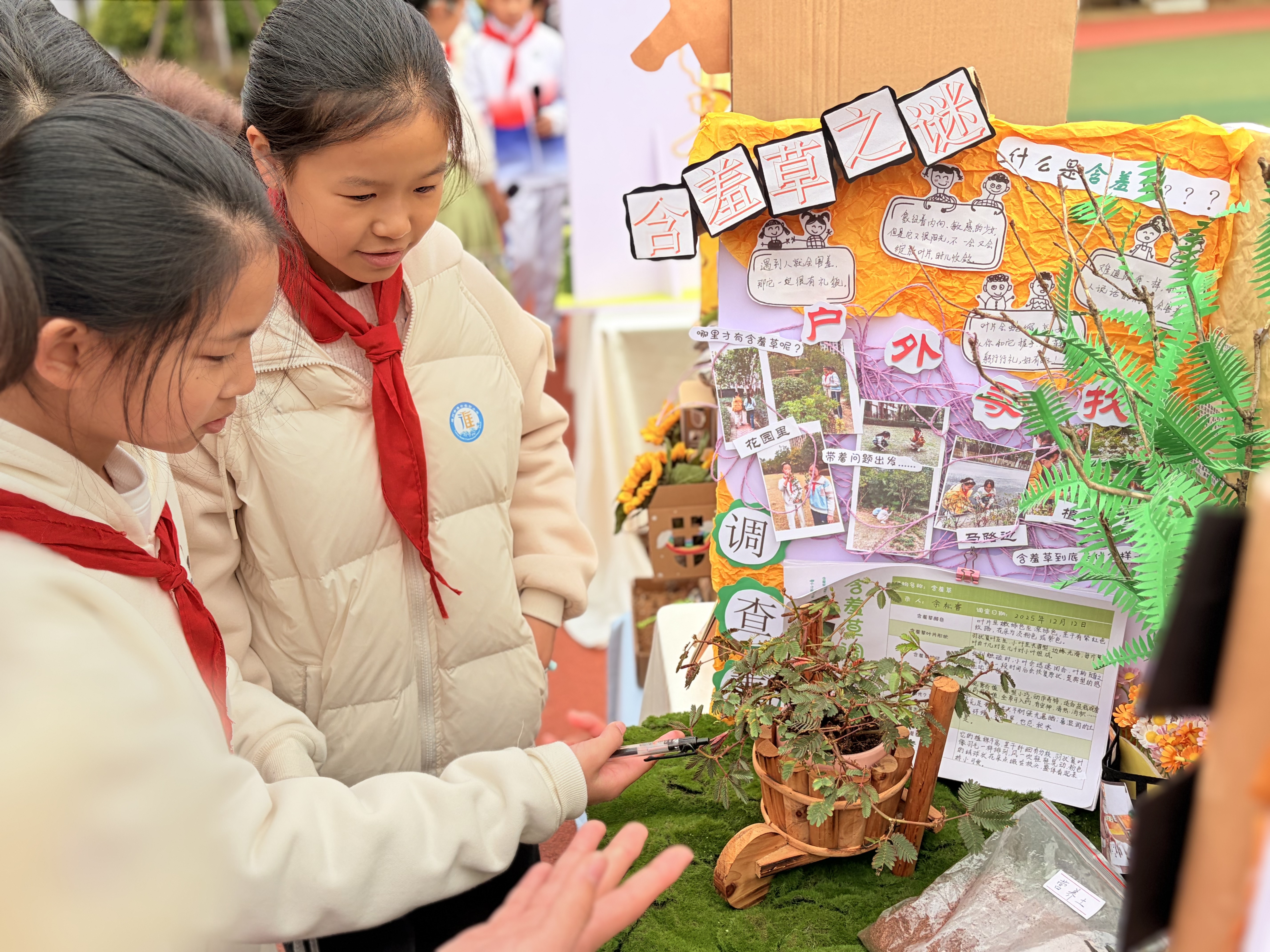 本次嘉年华的“学生研究型成果展”,正是为孩子们搭建了实践探索、突破自我的舞台。从低年级色彩斑斓的“牵牛花开花时间探究”海报,到高年级创意十足的“校园落叶变色原因分析”立体展板与实物模型,孩子们以动物、植物、微生物或自然现象为研究对象,完成了一场“从观察到结论”的完整科学实践。