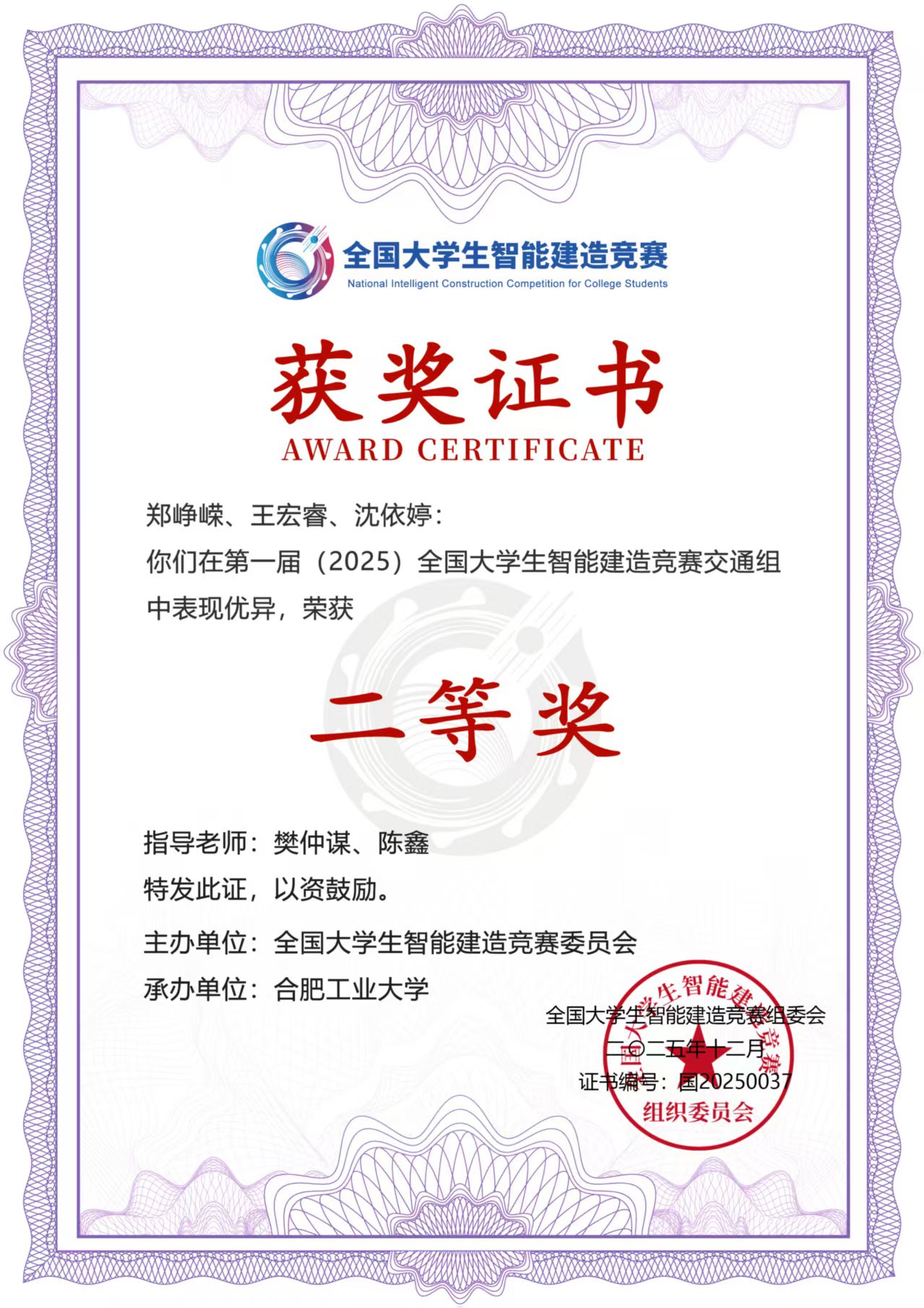 2025年12月5-7日,首届全国大学生智能建造竞赛在合肥工业大学举行。本次竞赛聚焦“数字孪生·智慧场景”核心主题,吸引全国21所高校47支代表队、近230名师生同台竞技。经过两天激烈角逐,我校交通与土木工程学院派出的两支队伍凭借出色的创新思维与扎实的实践能力,分别斩获土木组二等奖与交通组二等奖的优异成绩。