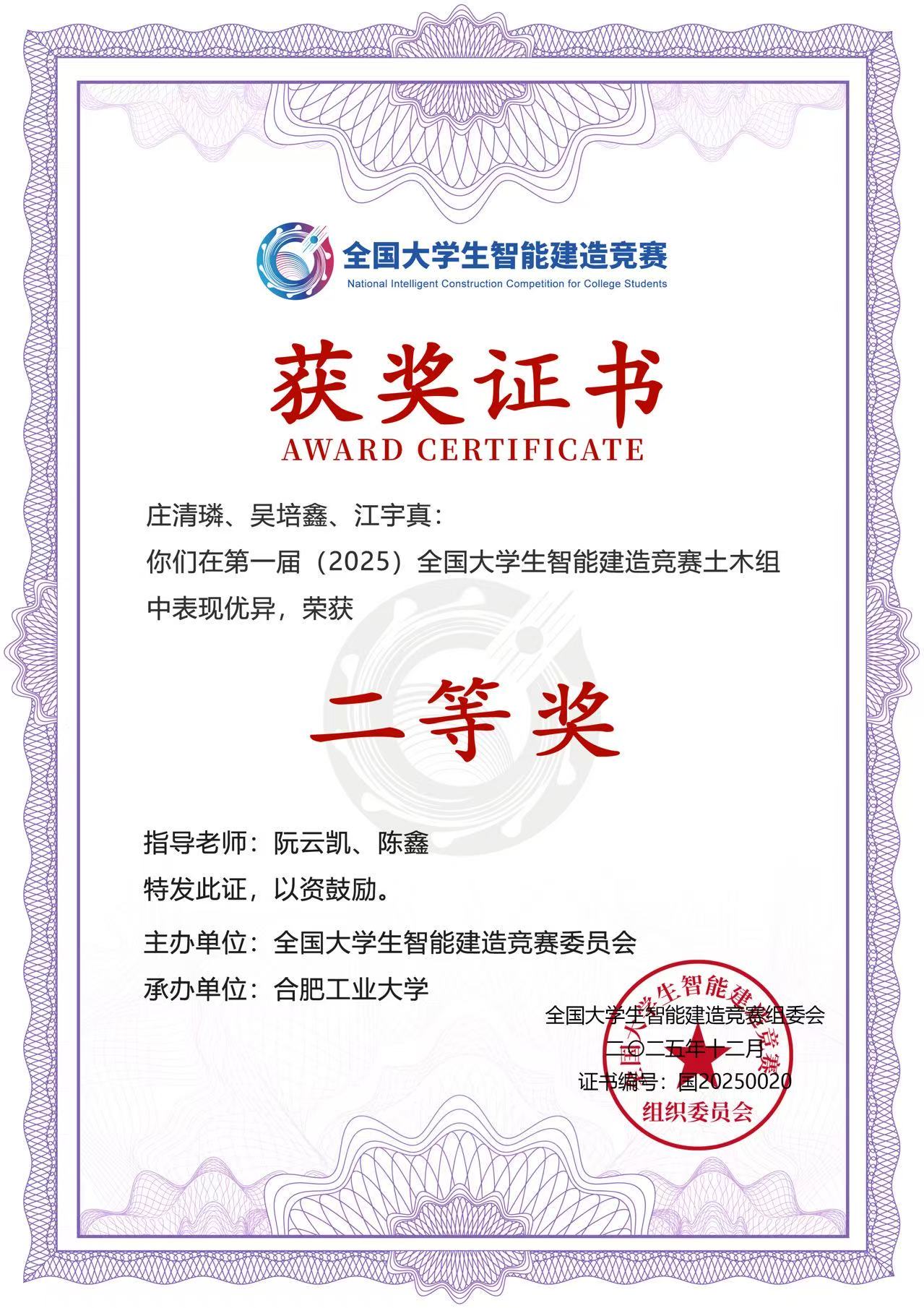 此次获奖,不仅是对我校学子专业能力与创新思维的肯定,更是我校在智能建造领域学科建设、人才培养成果的集中体现。未来,我校将继续以学科竞赛为抓手,深化产教融合、科教融汇,推动智能建造相关专业的教学改革与实践创新,着力培养更多适应行业发展需求的高素质工程技术人才,为智能建造领域的发展持续贡献高校力量。