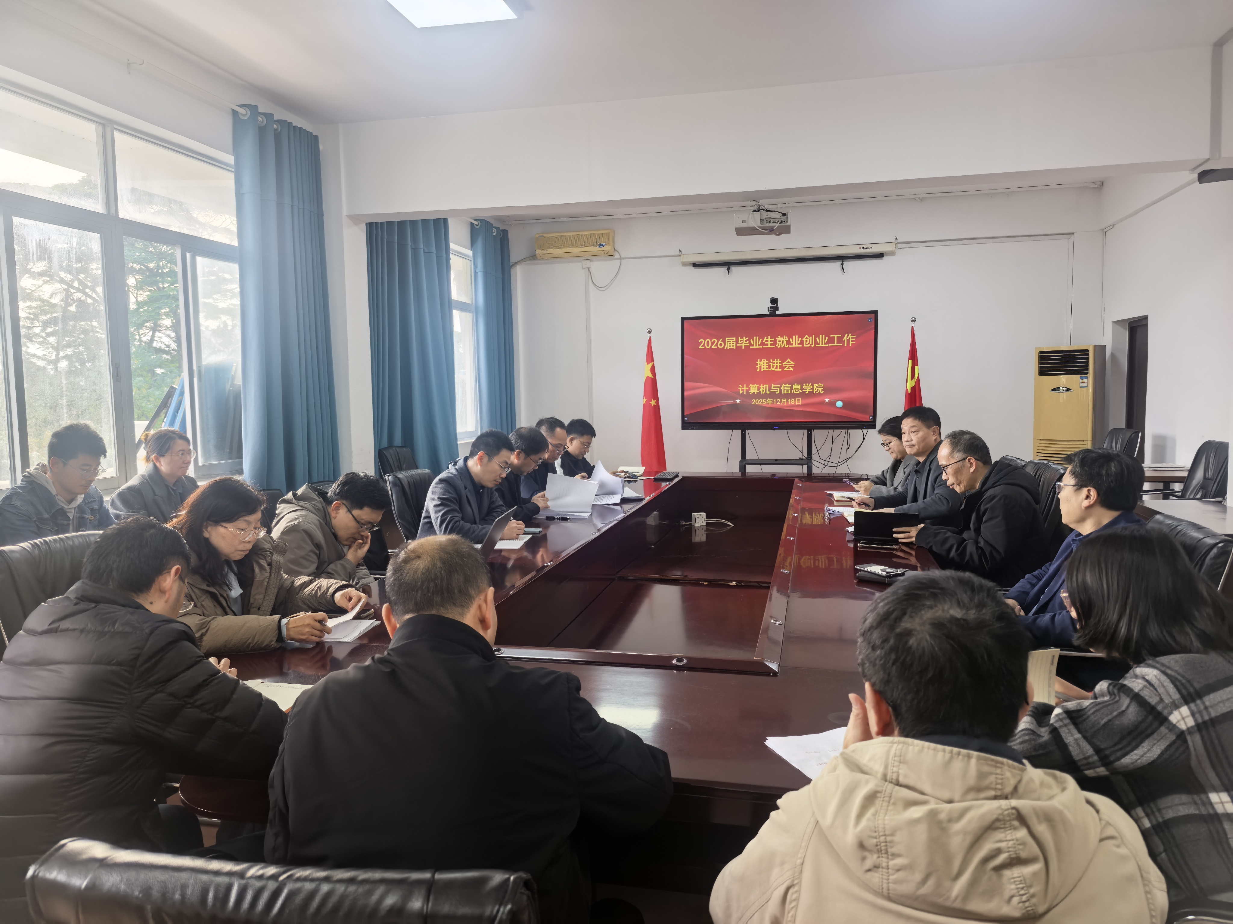12月18日,计算机与信息学院在院办302会议室召开2026届毕业生就业创业工作推进会。会议紧扣学校关于就业创业工作的重要部署要求,以早谋划、早部署、早行动为原则,全面启动并系统安排学院2026届毕业生就业创业各项工作。学院党委书记曾起郁、院长钟一文、党委副书记陈菁、副院长王李进及各专业系主任、毕业班辅导员参加会议。