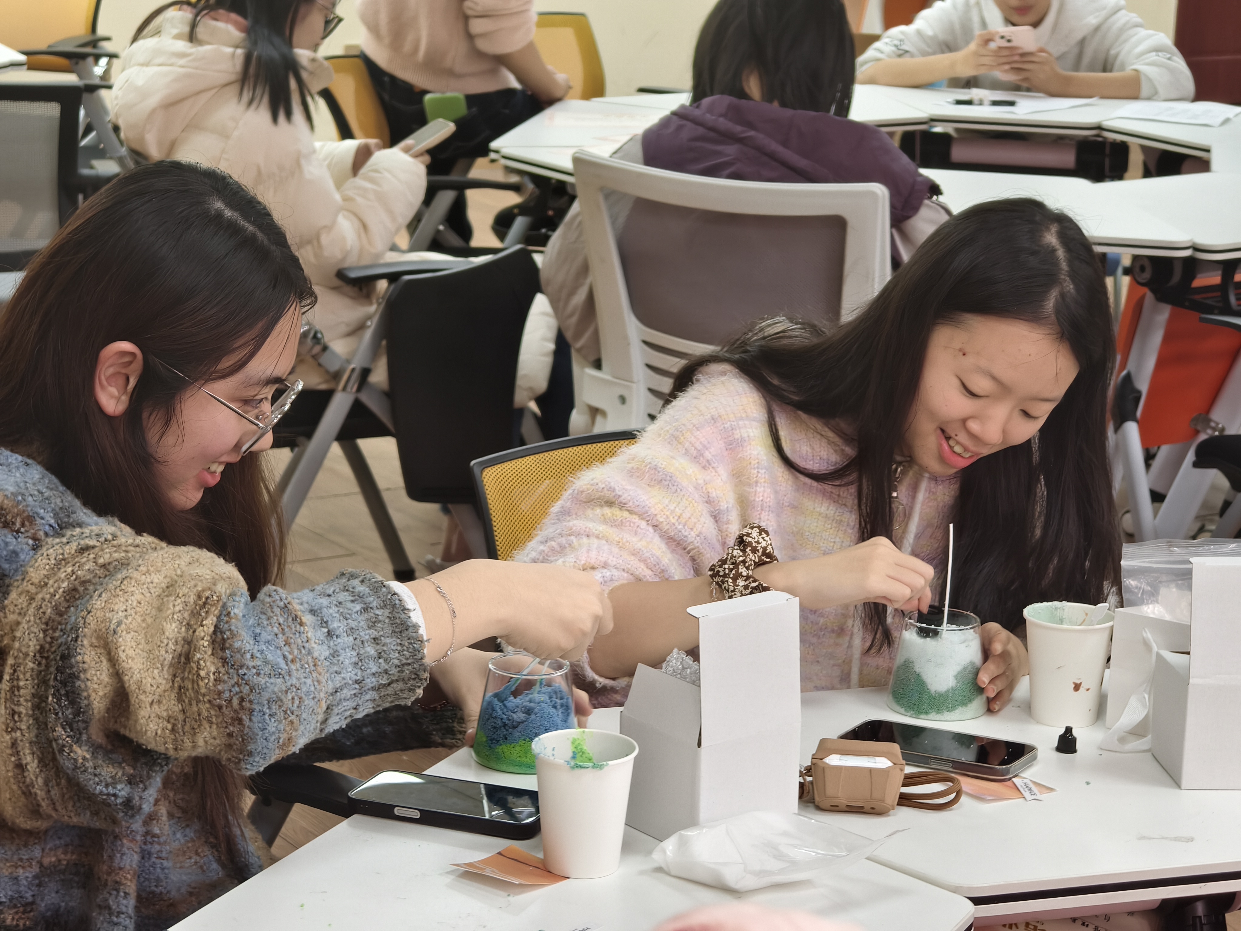 活动全程将自然疗愈理念深度融入实践,陪伴老师通过专业引导、流程演示与心得分享,帮助学子在专注创作中释放压力、调节情绪。从材料挑选到作品成型,从独立构思到团队协作,学子们不仅提升了审美素养与创新思维,更在彼此陪伴中建立了深厚情谊,实现了“人与自我、人与他人、人与自然”的三重联结。