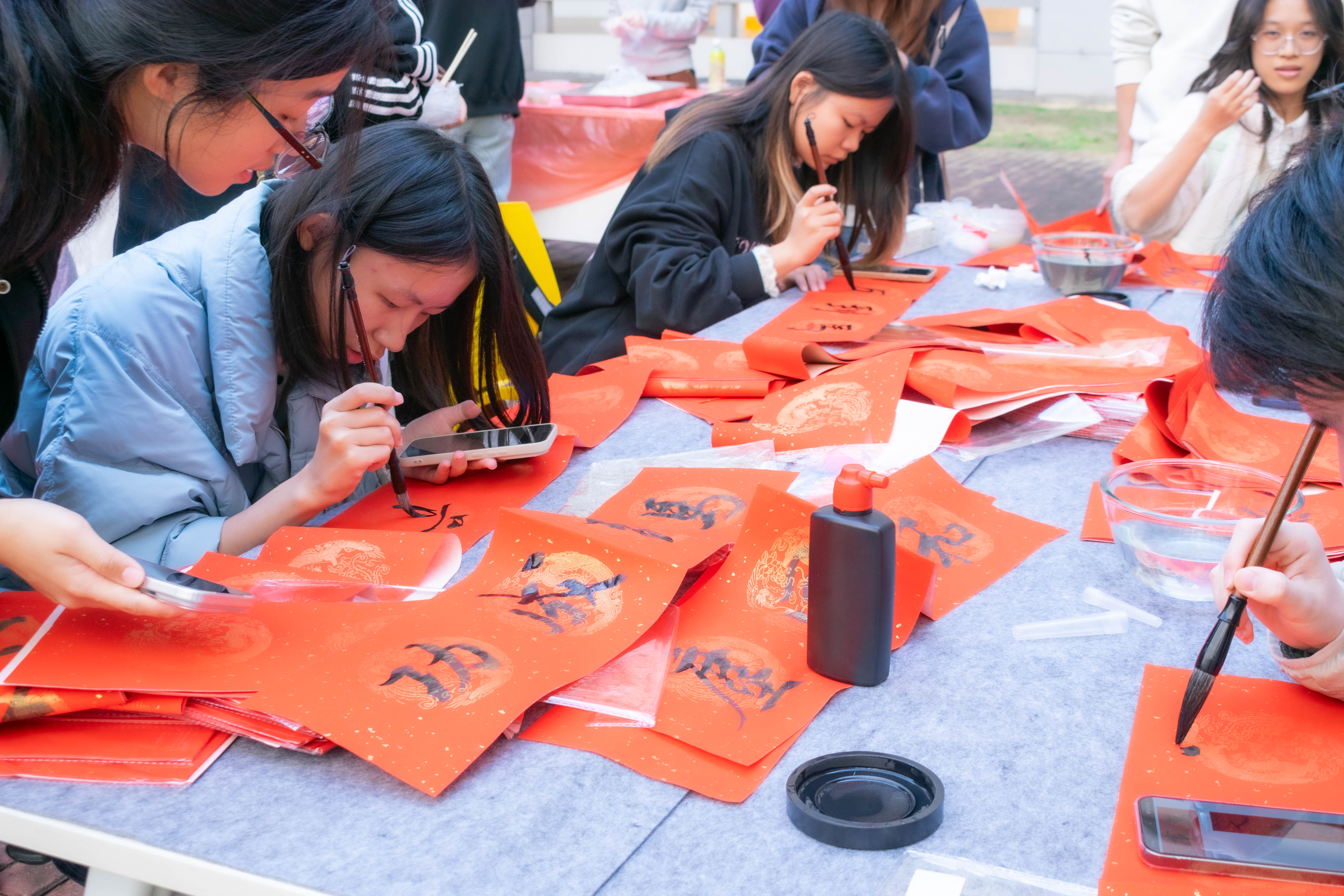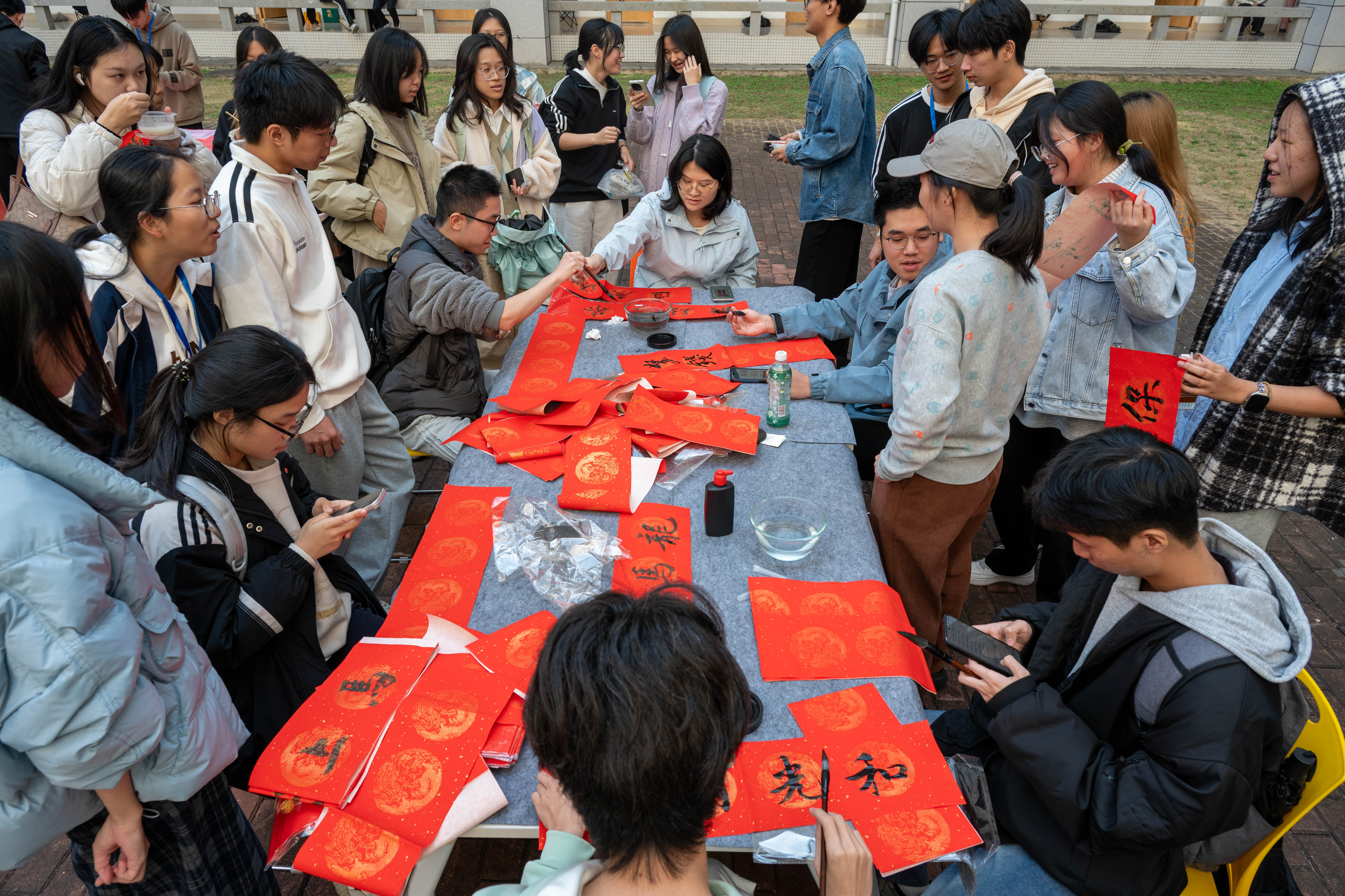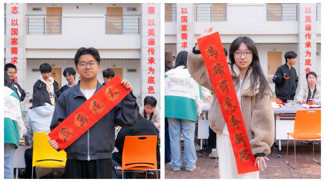 在“妙笔书‘楹’福”环节中,现场提供了红纸、毛笔、墨汁等材料。师生们或静心临摹,或即兴创作,一笔一画间承载着对考研学子的祝福、对新年的期盼。一副副饱含心意的春联和福字,成为冬日里最温馨的礼物,可装饰宿舍亦可赠予亲友。