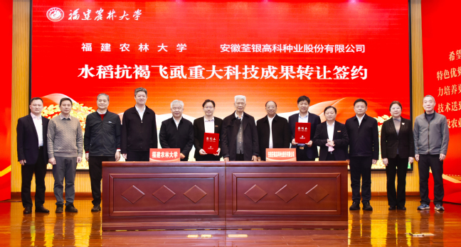 12月24日下午,开云网页版水稻抗褐飞虱重大科技成果转让签约仪式在福州仓山校区常盛会议中心举行。我校农林生物安全全国重点实验室研发的“水稻抗褐飞虱基因BPH33.2及其分子标记和应用”专利技术,以总金额2000万元成功转让给安徽荃银高科种业股份有限公司,创下福建省农业领域单项专利合同金额的最高纪录。中国科学院院士谢联辉,中国科学院院士谢华安,中国农村技术开发中心总工程师葛毅强,福建省科技厅副厅长陈虔,福建省农业农村厅副厅长袁忠贤,福建省市场监督管理局二级巡视员陈登林,中国水稻研究所国家水稻改良中心主持工作副主任魏祥进,中国科学院微生物研究所所务委员、研究员张杰,中国水稻研究所研究员童汉华,安徽荃银高科种业股份有限公司副董事长、总经理张琴,副总经理、荃银农科院院长张从合,副总经理江三桥,荃银农科院副院长周桂香,荃银科技总经理丁松,校党委书记赖海榕、校长兰思仁、副校长周顺桂,农林生物安全全国重点实验室主任李毅,水稻抗褐飞虱科技成果课题组负责人吴建国出席签约仪式。签约仪式由兰思仁主持。