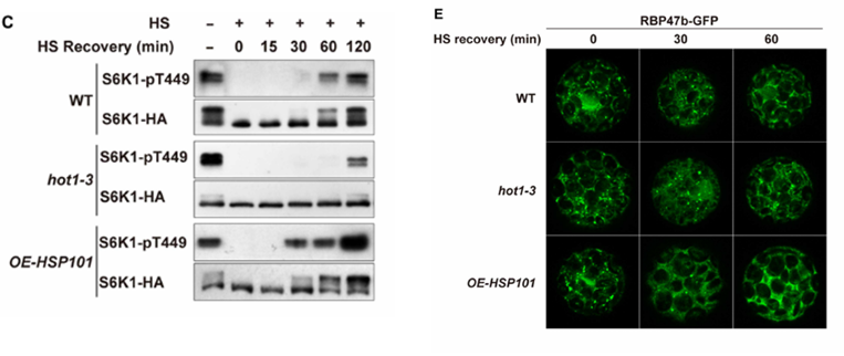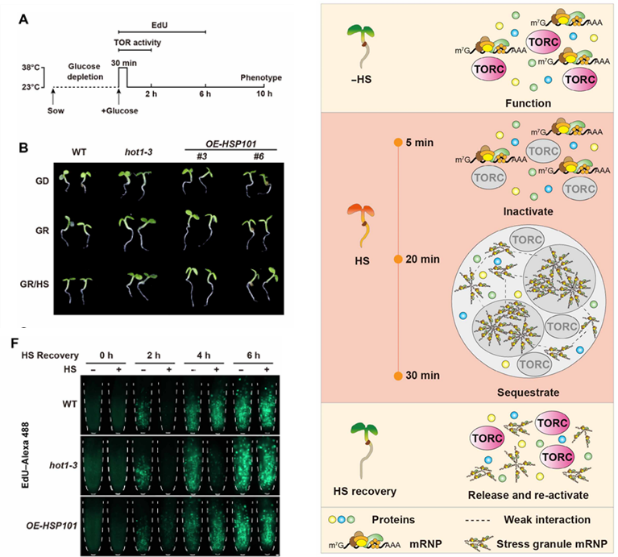 后续研究发现,热激迅速抑制TOR激酶的活性。而在热激后的恢复过程中,TOR活性约在40分钟后开始回升。若预处理抑制应激颗粒形成的放线菌酮(CHX),TOR活性恢复提前至20分钟,暗示应激颗粒的解聚速率影响TOR再激活的速率。进一步通过调控热休克蛋白HSP101(影响应激颗粒解聚)的遗传材料发现:与野生型相比,在功能缺失突变体hot1-3中,应激颗粒的解聚与TOR活性的恢复均减缓;而在HSP101过表达植株中,二者恢复均加快。(图2)。以上结果进一步证实SG的动态变化调控TOR信号通路在热胁迫后的重激活。