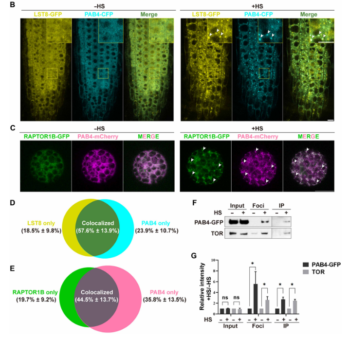 本研究首先以应激颗粒的标志蛋白PAB4和RBP47B作为观察对象,发现TOR抑制剂处理不影响热激期间应激颗粒的形成。在植物中, TOR复合物1(TOC1)包括三个核心组分:TOR, RAPTOR1B和LST8。本研究进一步发现,RAPTOR1B和LST8在热激后能够形成聚合物,并且与PAB4和RBP47B形成的应激颗粒基本共定位。由于难以获得TOR稳定遗传的转基因材料,本研究通过差速离心结合免疫沉淀的技术,证实TOR蛋白可被富集于PAB4形成的应激颗粒中。以上结果表明,热激后,TOR及其复合体组分RAPTOR1B、LST8被招募到应激颗粒中(图1)。