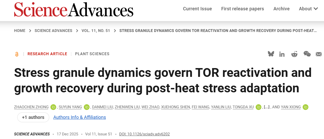 近日,我校熊延教授团队在期刊《科学进展》Science Advances上发表了题为“Stress granule dynamics govern TOR reactivation and growth recovery during post-heat stress adaptation”(应激颗粒动态调控热胁迫后应激适应过程中TOR激酶的再激活与生长恢复)的研究论文,揭示了植物在热胁迫适应过程中应激颗粒与TOR信号通路之间的调控机制。