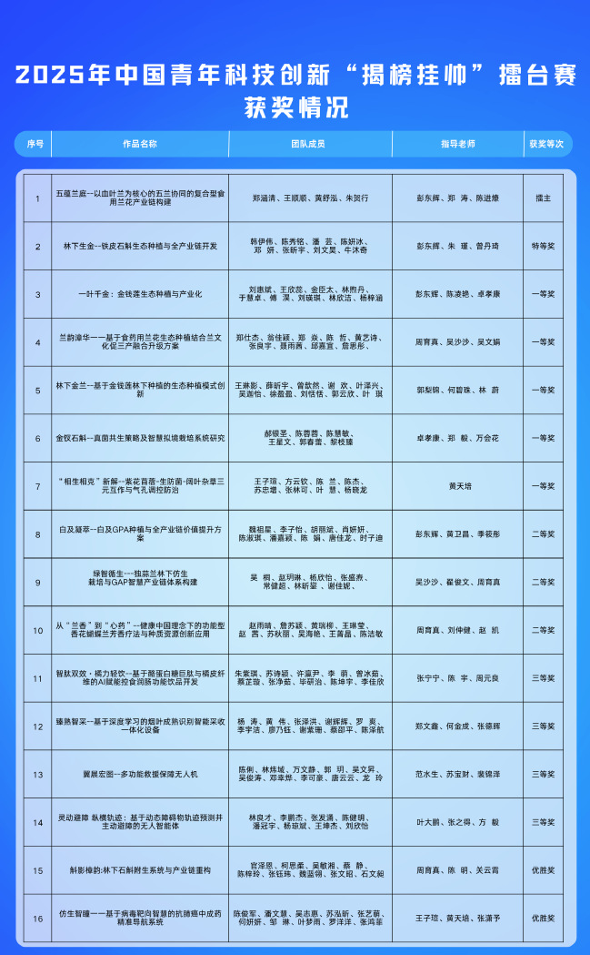 112、10月31日至11月3日,在第十九届“挑战杯”全国大学生课外学术科技作品竞赛决赛中,学校在主体赛、“揭榜挂帅”擂台赛、“人工智能+”专项赛共斩获国家奖25项,以团体总分位列全国高校第36位的优异成绩捧得“优胜杯”,成为全国56所“优胜杯”高校中唯一一所农林类高校。