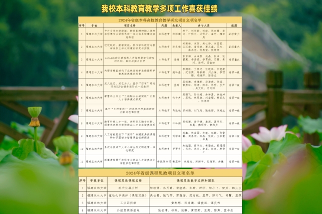 1、1月,学校在省级教学成果、教育教学研究、课程思政示范项目、优秀教学案例等方面建设成效显著,在省内外多项教育教学工作的评比中获佳绩。其中,14个项目荣获高等教育省级本科教学成果奖(省级成果奖数量、质量均取得新突破)、11项教研项目获批福建省本科高校教育教学研究项目、4个项目获评第四批省级课程思政示范项目、29个案例获评优秀教学案例。