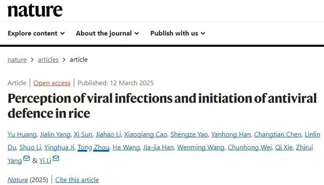 18、3月,李毅团队在国际顶级学术期刊Nature(《自然》)杂志上发表了题为“Perception of viral infections and initiation of antiviral defence in rice”(水稻感知病毒侵染并启动抗病毒防御的机制)的研究论文,首次揭示了水稻如何感知病毒入侵并激活抗病毒免疫反应的核心机制。