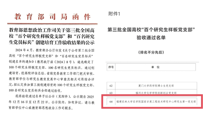 129、12月16日,教育部思想政治工作司公示了第三批全国高校“百个研究生样板党支部”和“百名研究生党员标兵”创建验收通过名单,学校首个全国研究生党建样板支部(全省三个)——农学院国家甘蔗工程技术研究中心研究生第一党支部通过验收。