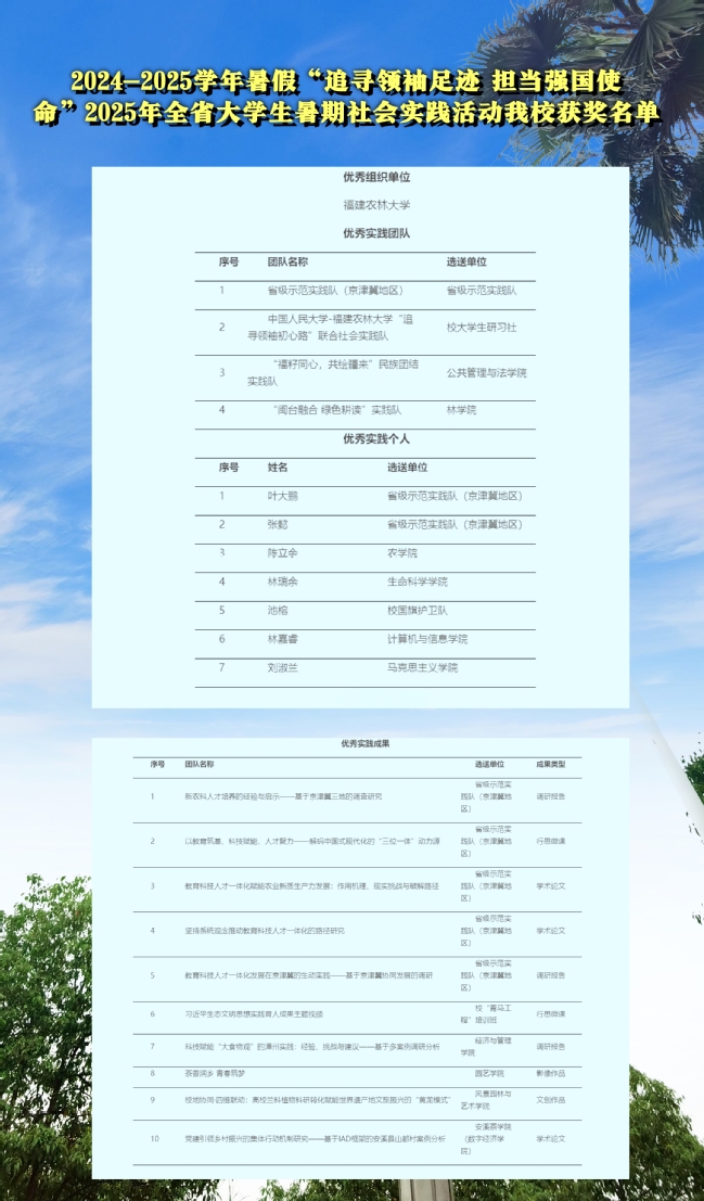 117、11月,共青团福建省委、福建省青年联合会授予一批2025年度福建青年五四奖章、福建新时代青年先锋和“两红两优”表彰对象。学校荣获5项表彰,其中,开云网页版农林生物安全全国重点实验室团队获“福建青年五四奖章集体”,海峡联合研究院(未来技术学院)王琴教授和植物保护学院吴升晏教授2位老师获“福建青年五四奖章”,公共管理与法学院2023级公共管理专业研究生吴松泽同学获“福建省优秀共青团员”,校团委谢国富老师获“福建省优秀共青团干部”。
