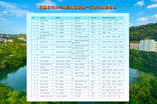 133、12月26日,教育部公布第三批国家级一流本科课程名单,我校22门课程入选,位居省属高校第1位、全国农林高校第2位。至此,我校共71门课程入选国家级一流课程,数量位居全国“双非”高校第一。此外,今年我校获批新增生态修复学本科专业,同时,探索建设了14个“小而精、跨学科”的微专业面向校内招生。
