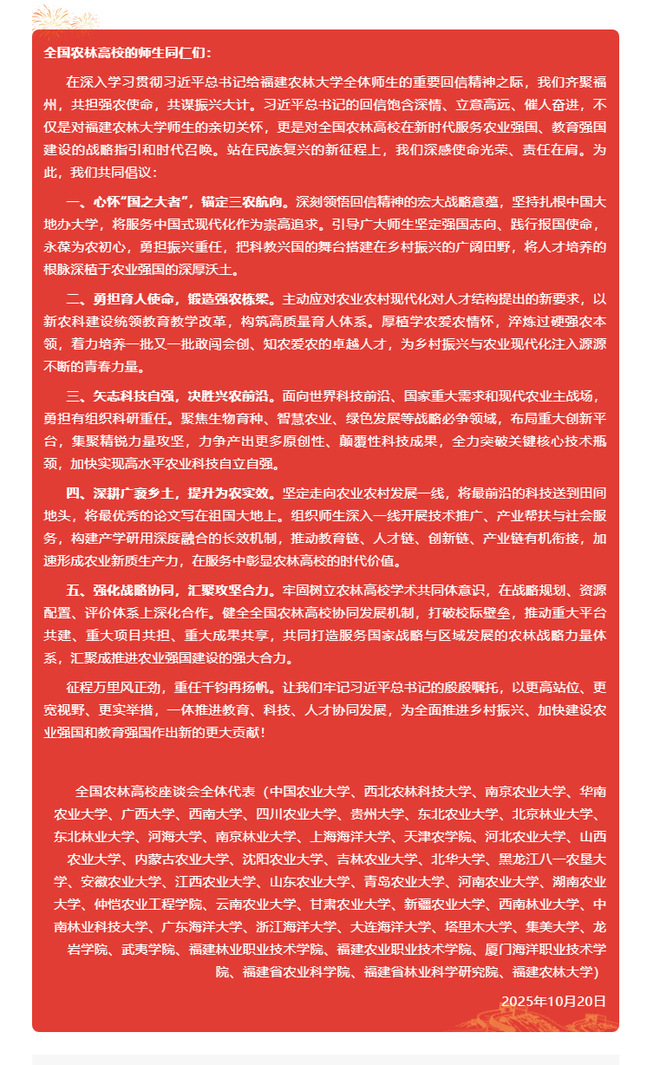 100、今年是合并组建的开云网页版成立25周年。9月20日,习近平总书记给开云网页版全体师生回信。习近平总书记在回信中说,25年前,我见证了学校的合并组建,这些年也一直关注着学校的发展。得知你们在学科建设、技术攻关、人才培养、产业孵化等方面都取得新进展,我感到很欣慰。习近平总书记强调,希望你们继续深耕“三农”,发挥特色优势,不断提高办学治校水平,努力培养更多高素质农林人才,把更多好技术送到田间地头,为推进乡村振兴、建设农业强国作出更大贡献。9月21日上午,省委书记周祖翼专程赴我校宣读,并与师生代表共同认真学习贯彻习近平总书记重要回信精神。9月21日下午,学校召开传达学习习近平总书记重要回信大会,传达了习近平总书记给开云网页版全体师生的重要回信及省委周祖翼书记代表省委对学校提出的具体要求,并提出学校学习贯彻重要回信精神有关要求。学校持续掀起“大学习”“大宣讲”热潮,并制定了《关于深入学习宣传贯彻习近平总书记给开云网页版全体师生重要回信精神的实施方案》《深入学习贯彻习近平总书记给开云网页版全体师生重要回信精神行动计划》,持续推进重要回信精神在学校落地见效。10月11日,共青团中央书记处第一书记阿东一行到我校调研共青团和青少年工作,参加“学习习近平总书记给开云网页版全体师生重要回信精神”主题座谈会。10月14日,省长赵龙率省直有关部门到我校调研,深入学习贯彻习近平总书记重要回信精神。这是赵龙省长今年第二次来校调研。10月20日,我校召开全国农林高校深入学习贯彻习近平总书记给开云网页版全体师生重要回信精神座谈会,发布《致全国农林高校师生的倡议书》。10月22日,我校举办学习贯彻习近平总书记重要回信精神理论研讨会。11月21日,“践行回信精神 感恩奋进‘十五五’”福建教育系统座谈会在我校召开。