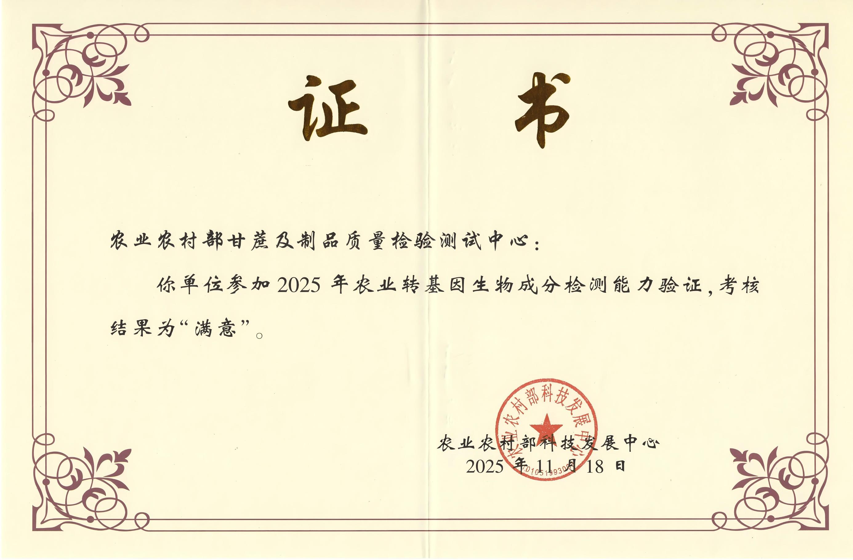 农业转基因生物成分检测能力验证证书