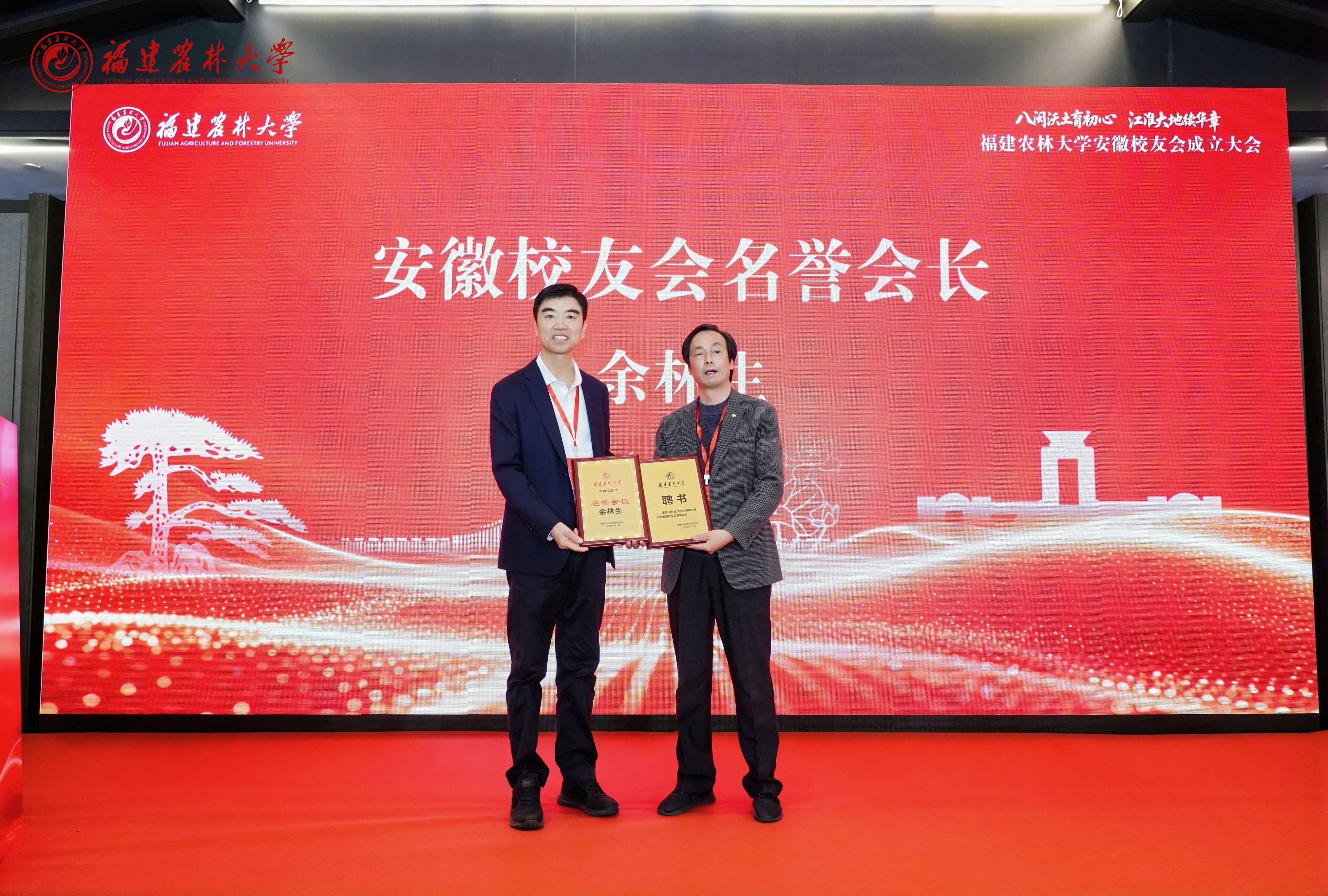 在热烈的掌声中,林庆藩、雷国铨与安徽校友会名誉会长余林生、会长高坡共同为安徽校友会揭牌。随后,林庆藩代表学校向安徽校友会授旗,并向安徽校友会名誉会长授牌,雷国铨为安徽校友会会长、执行会长等骨干授牌。现场还为校友之家、教学科研实践基地等有关校友合作单位颁牌。